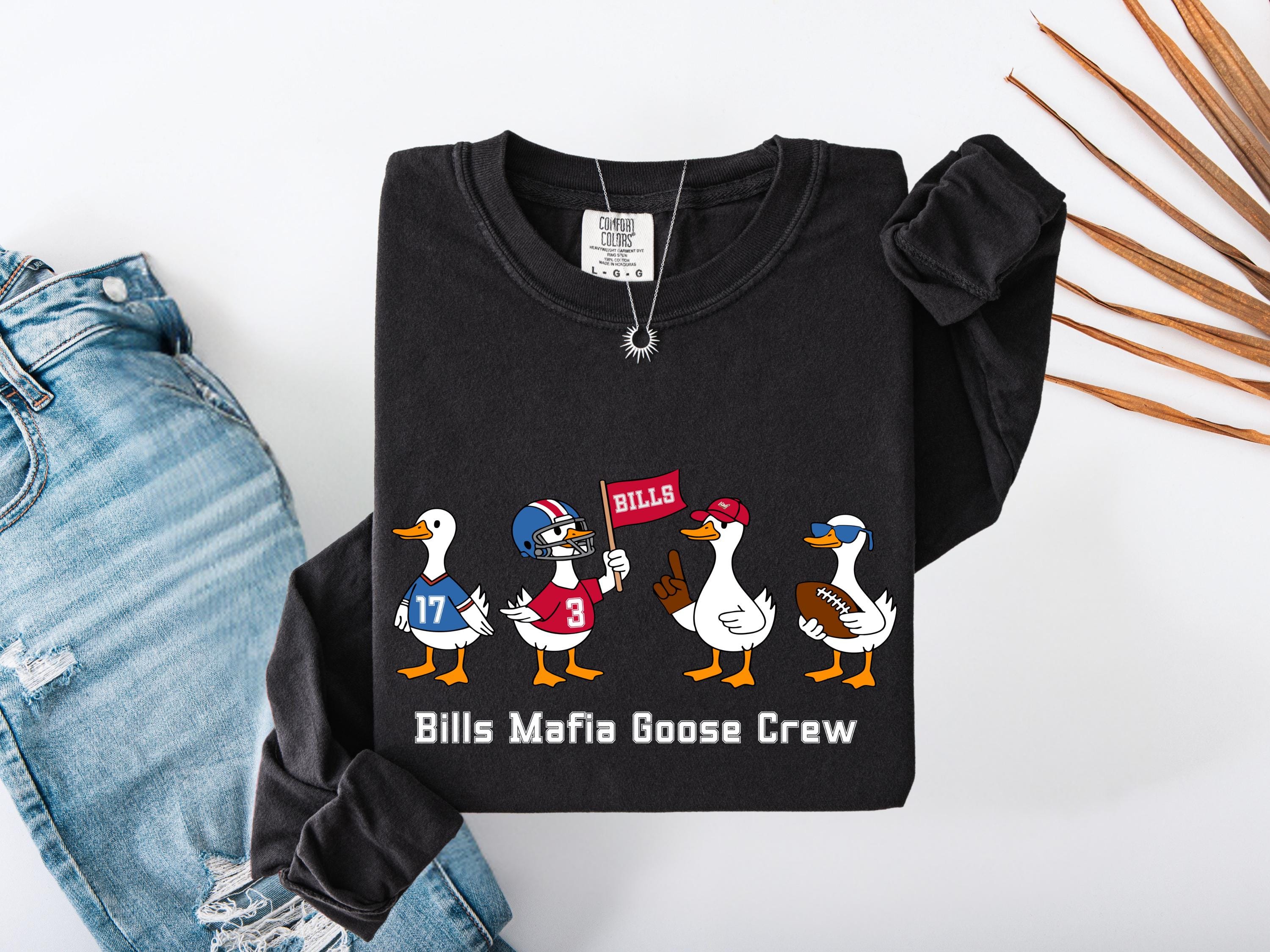 Cheer for your team in style with this funny Bills goose long sleeve shirt! Featuring the playful “Bills Mafia Goose Crew” design, this Comfort Colors tee is perfect for football fans who love humor and team spirit. Great for game days, tailgates, or as a unique Bills fan gift for women and men. Cozy, cute, and full of Buffalo pride.