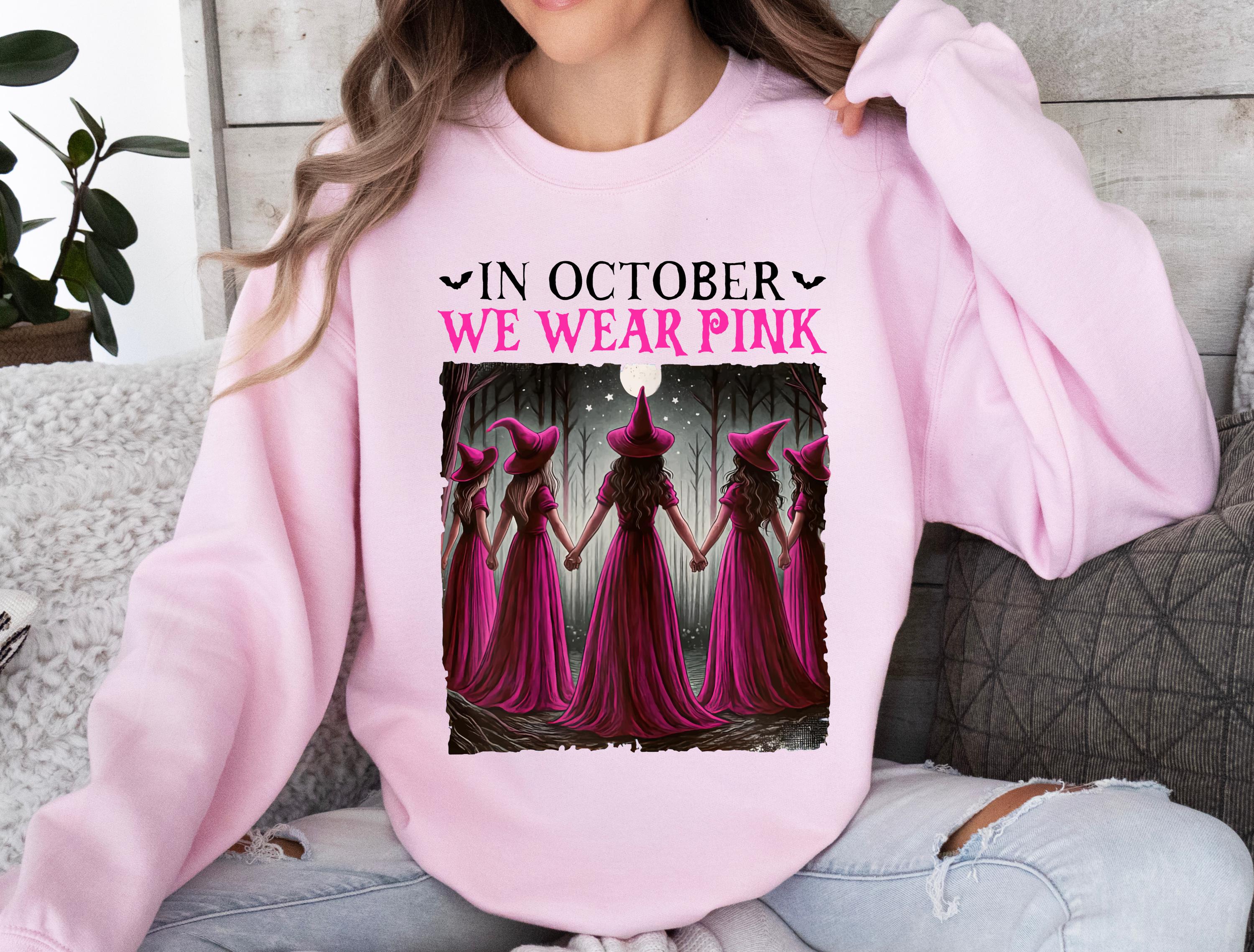 Show your spooky style and support breast cancer awareness with this “In October We Wear Pink” witch sweatshirt! Featuring a group of pink witches under the moonlight, this cozy crewneck is perfect for Halloween, October events, fall outfits, and awareness walks. A unique mix of spooky and meaningful that makes a great gift for friends, moms, and survivors.