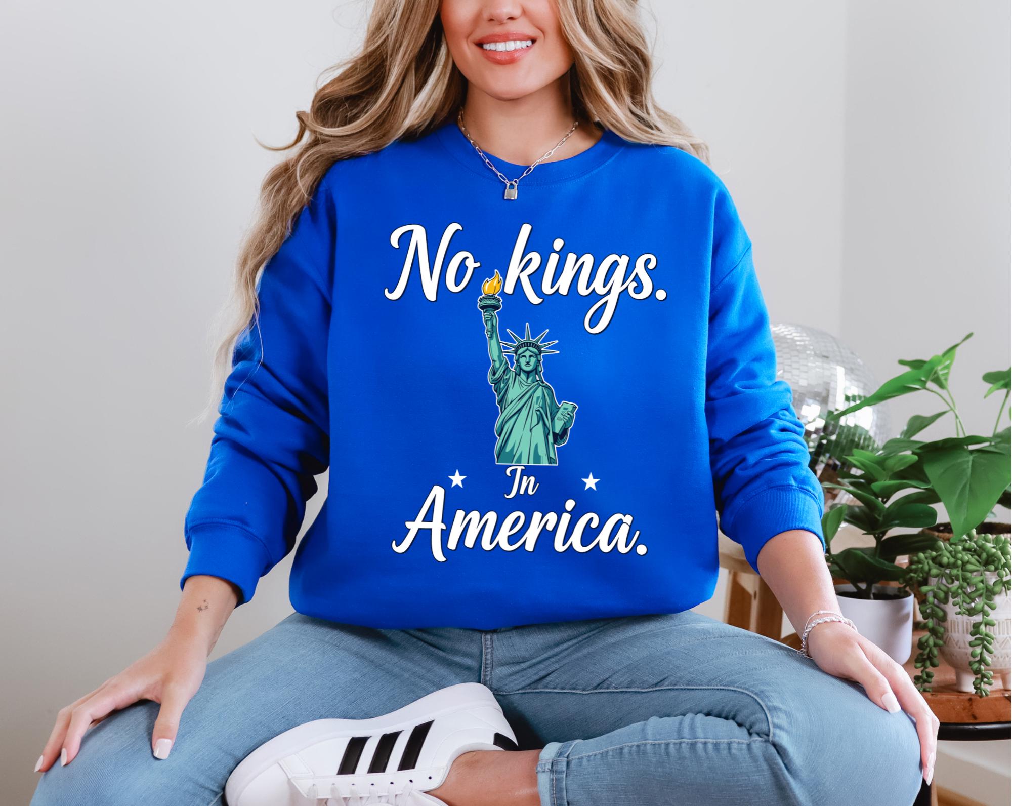 Celebrate freedom and independence with this No Kings In America Statue of Liberty sweatshirt. Perfect patriotic unisex crewneck for 4th of July, Independence Day, political rallies, or everyday wear. A bold USA statement gift for proud Americans who believe in liberty and no monarchy.