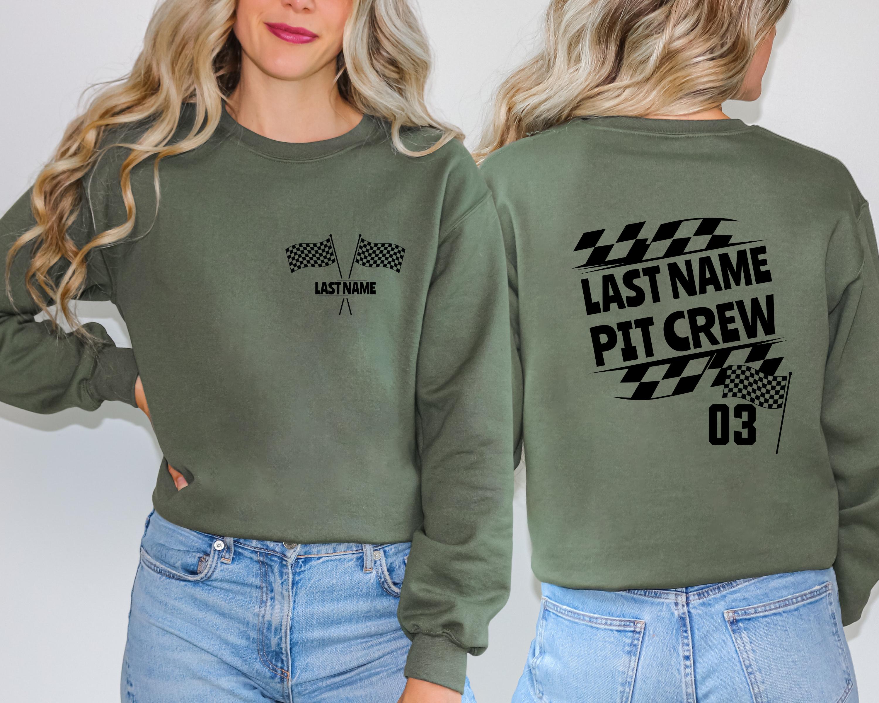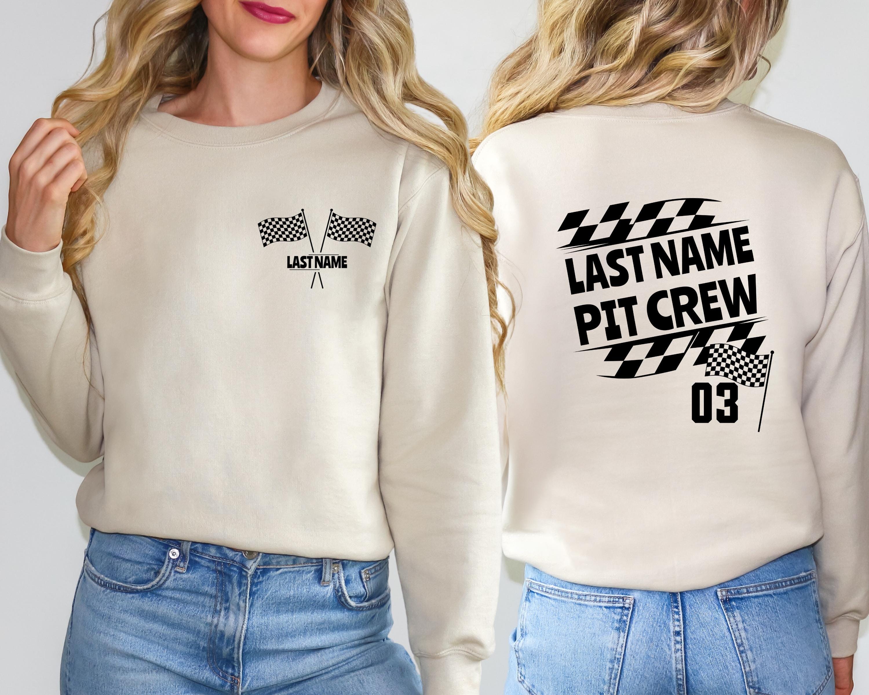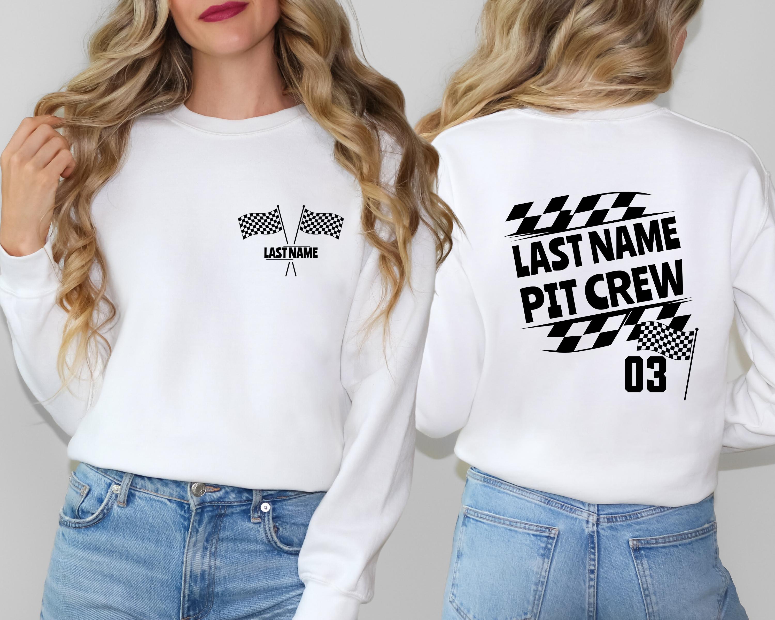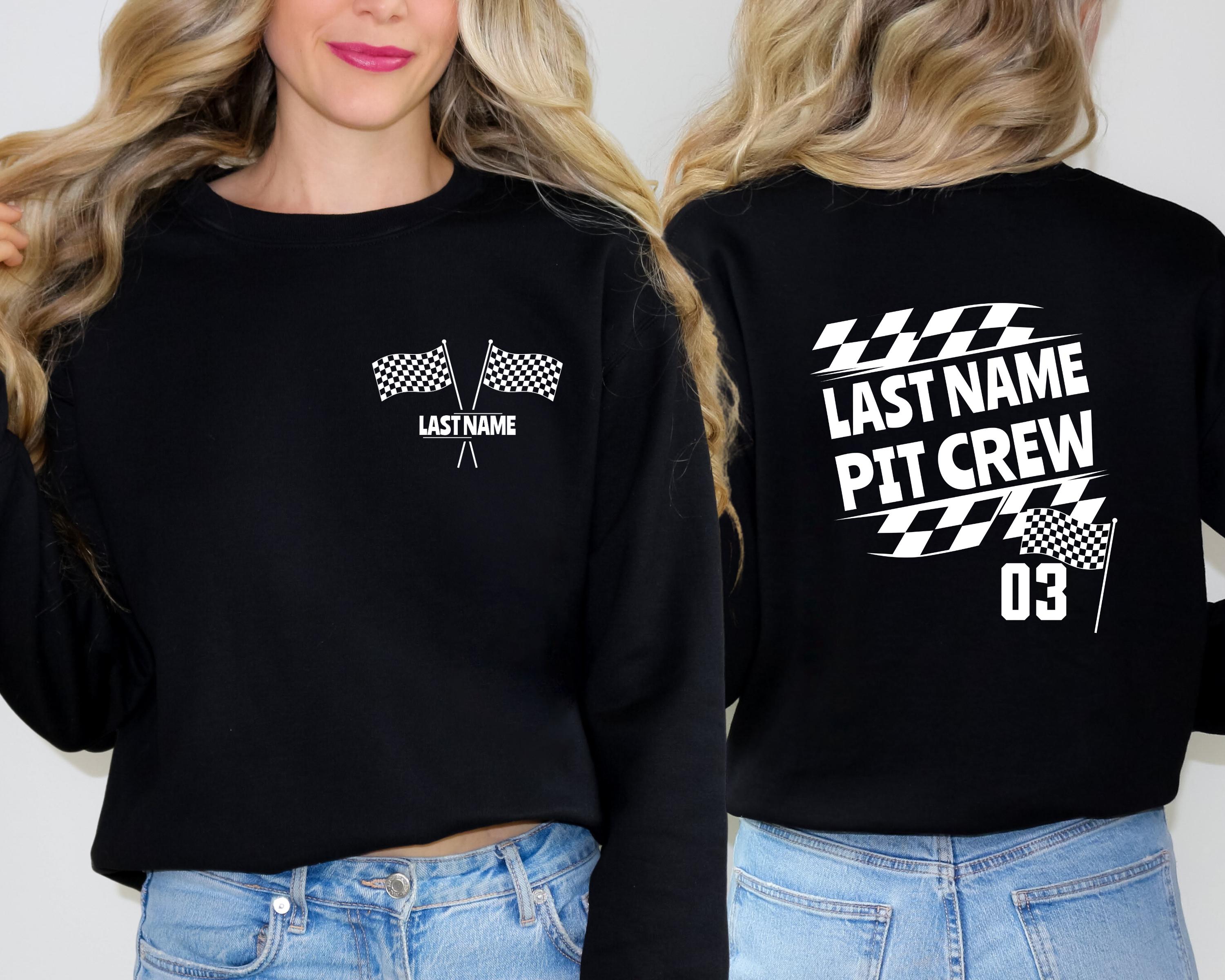 Gear up for race day with this custom Pit Crew shirt or sweatshirt featuring checkered flags and personalized last name + number. Perfect unisex outfit for NASCAR fans, racing families, birthday parties, or matching team events. A unique racing shirt for men and women who love speed, cars, and team spirit.