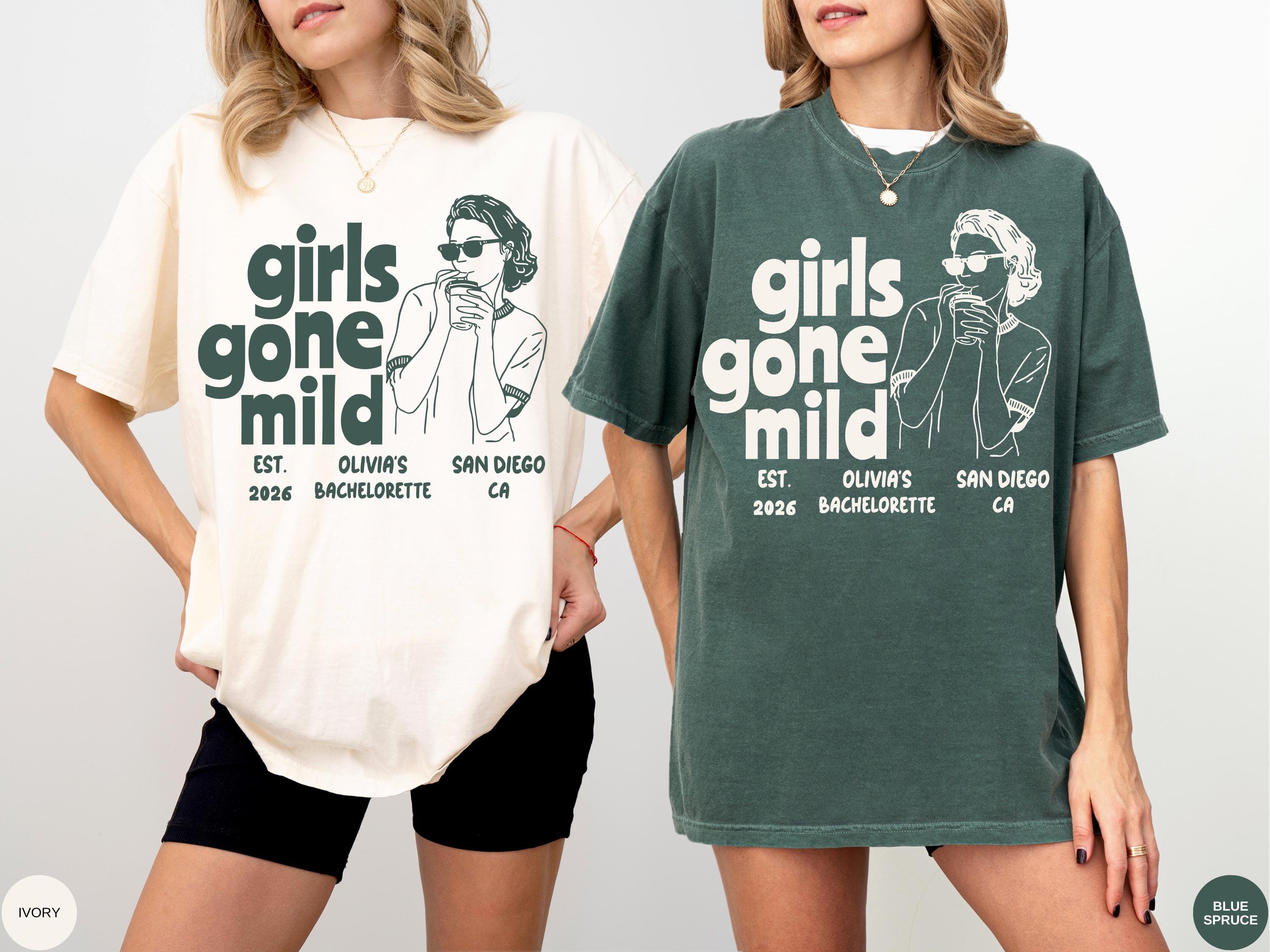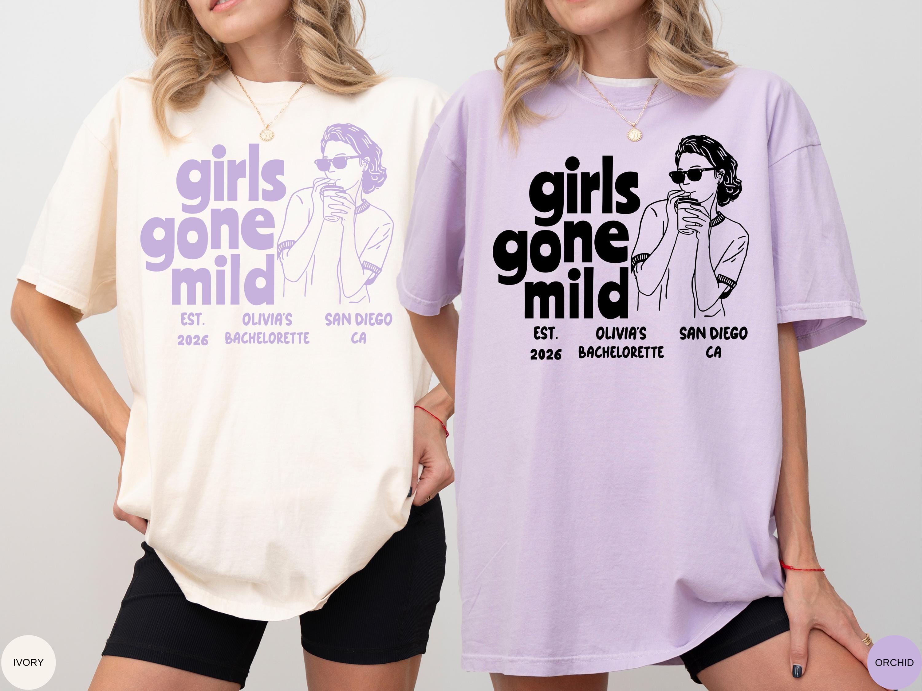 Celebrate your bachelorette in style with this Girls Gone Mild Comfort Colors shirt. Perfect funny custom tee for girls trips, bride squads, and party weekends. Add your name, date, or location to make it personalized. A trendy shirt for bridesmaids and friends to wear on bachelorette trips, girls’ weekends, or vacation parties.