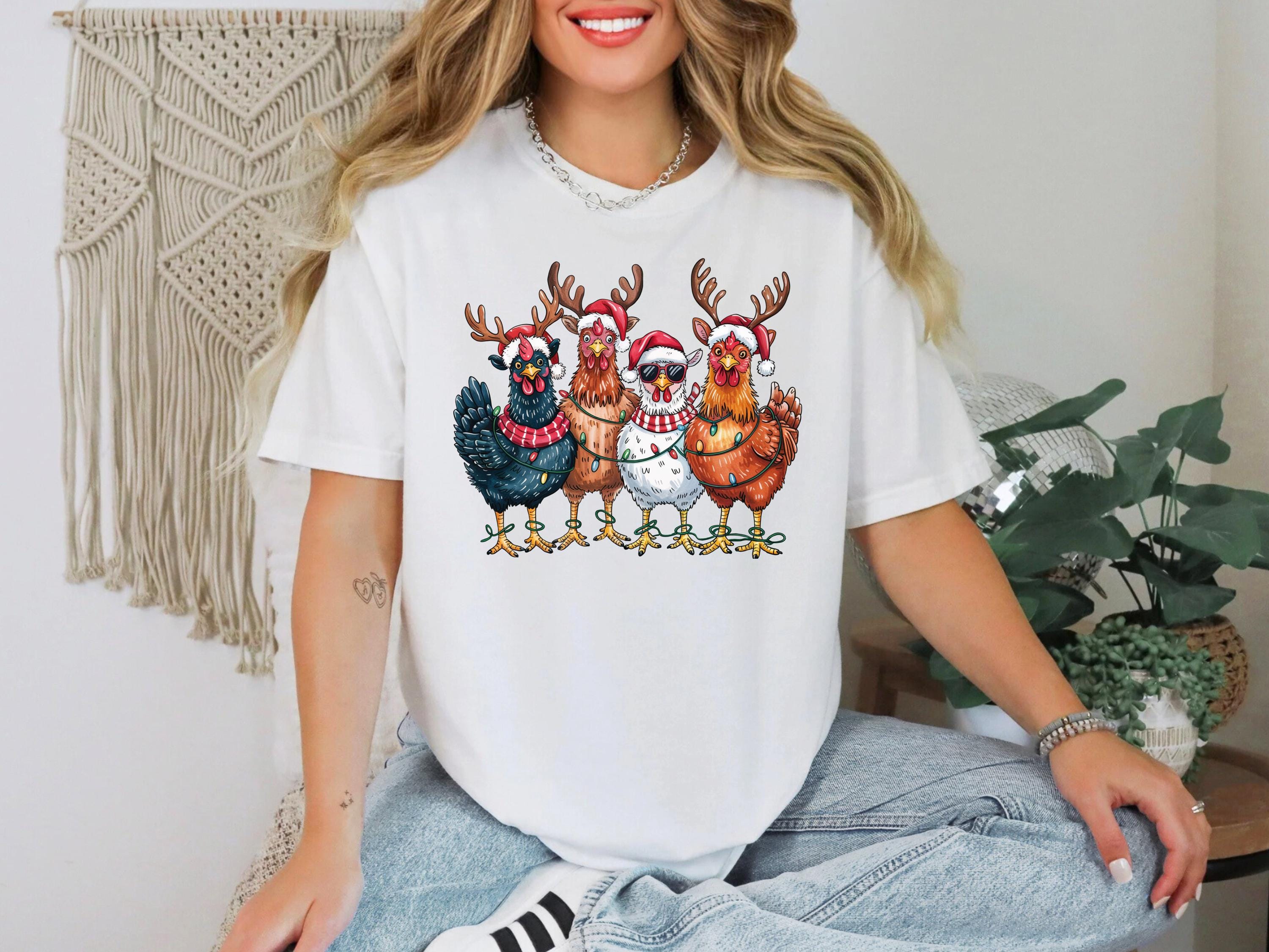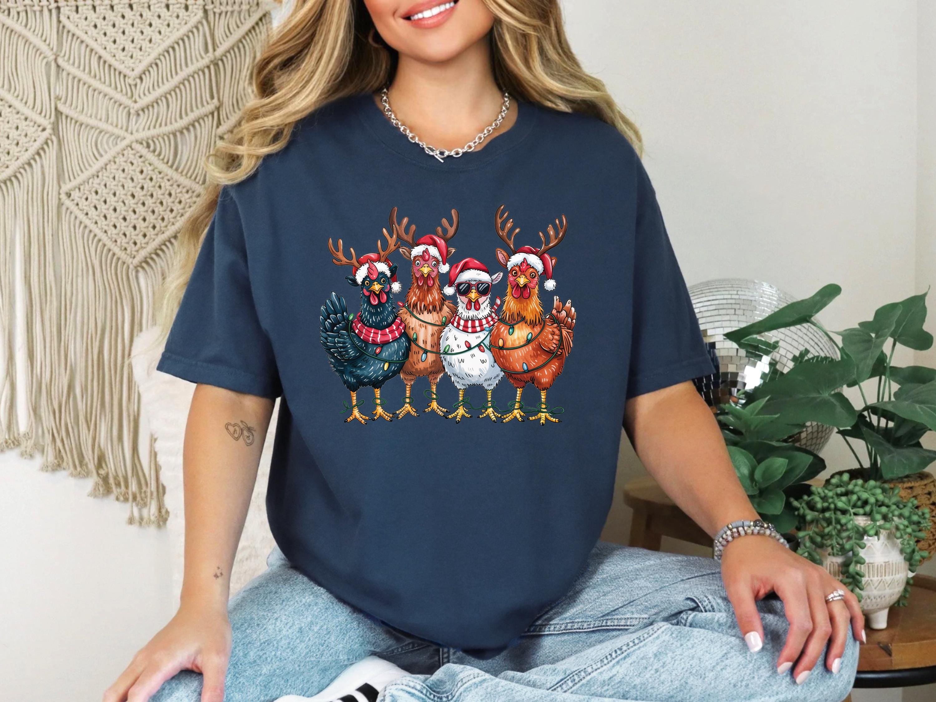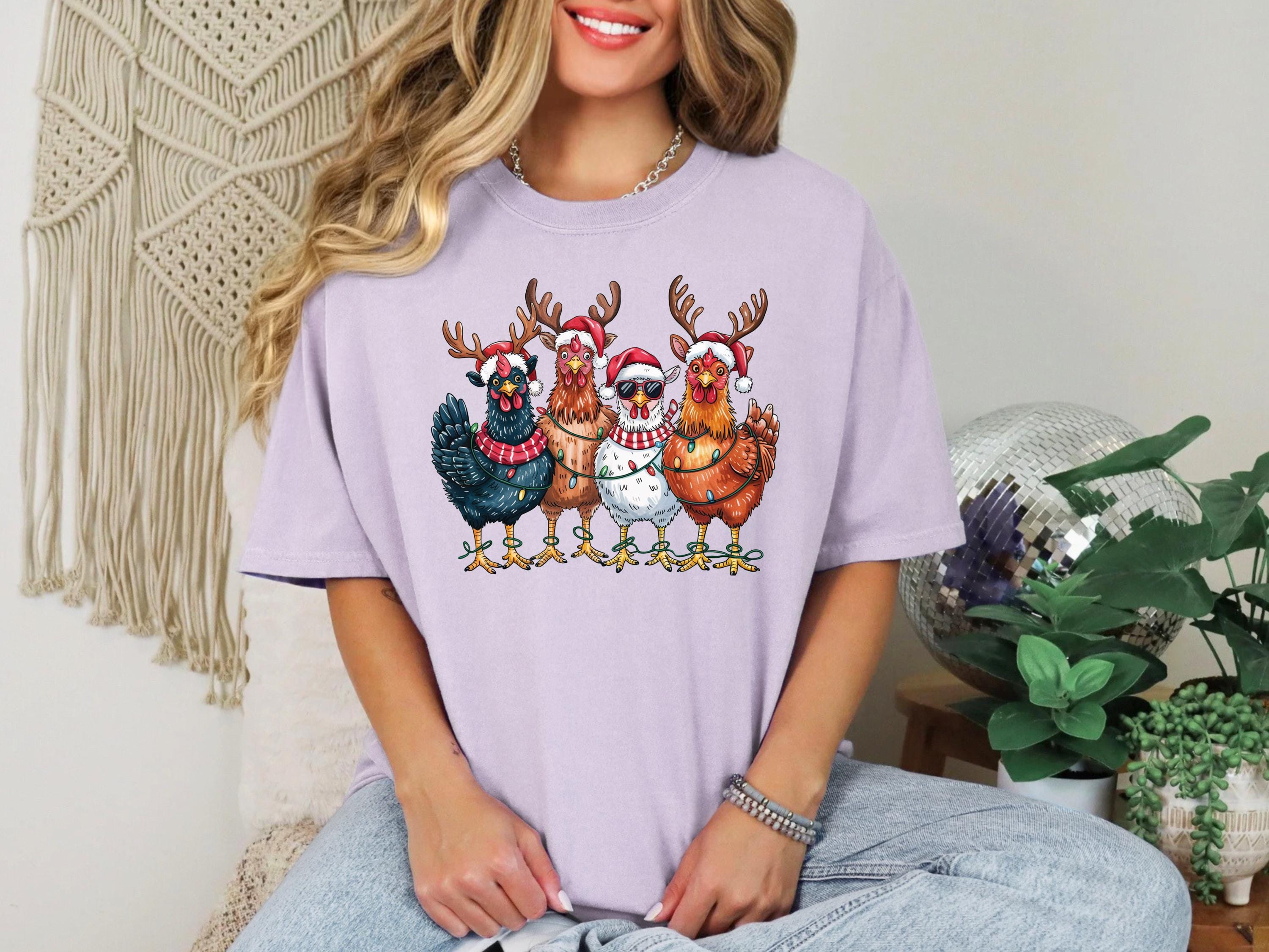 Bring holiday cheer with this Funny Christmas Chicken Comfort Colors shirt! Featuring festive chickens with Santa hats, reindeer antlers, and Christmas lights, itโs the perfect holiday farm tee. Great gift for chicken lovers, farmers, and anyone who enjoys a cute and funny Christmas shirt. Ideal for holiday parties or cozy winter outfits.