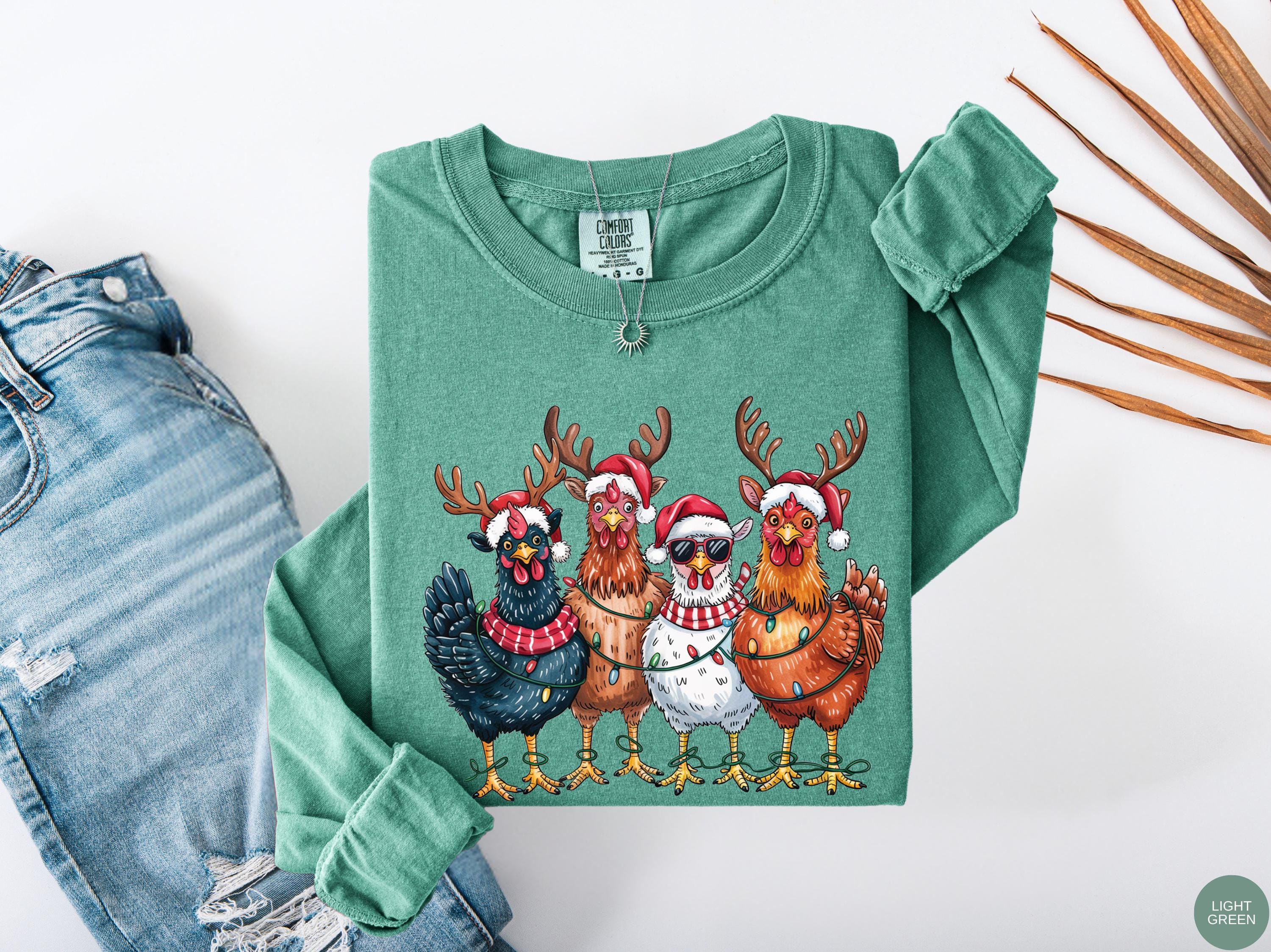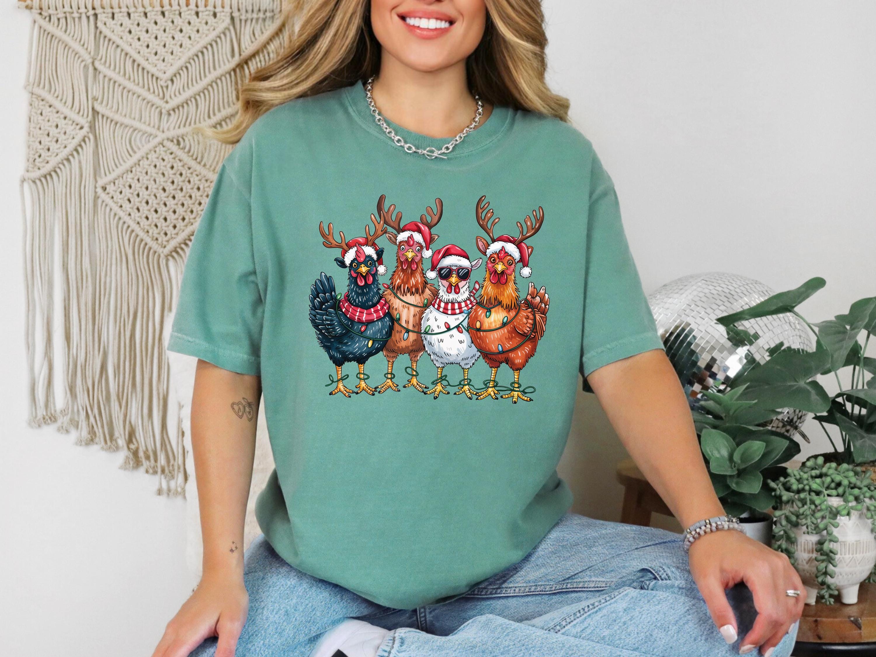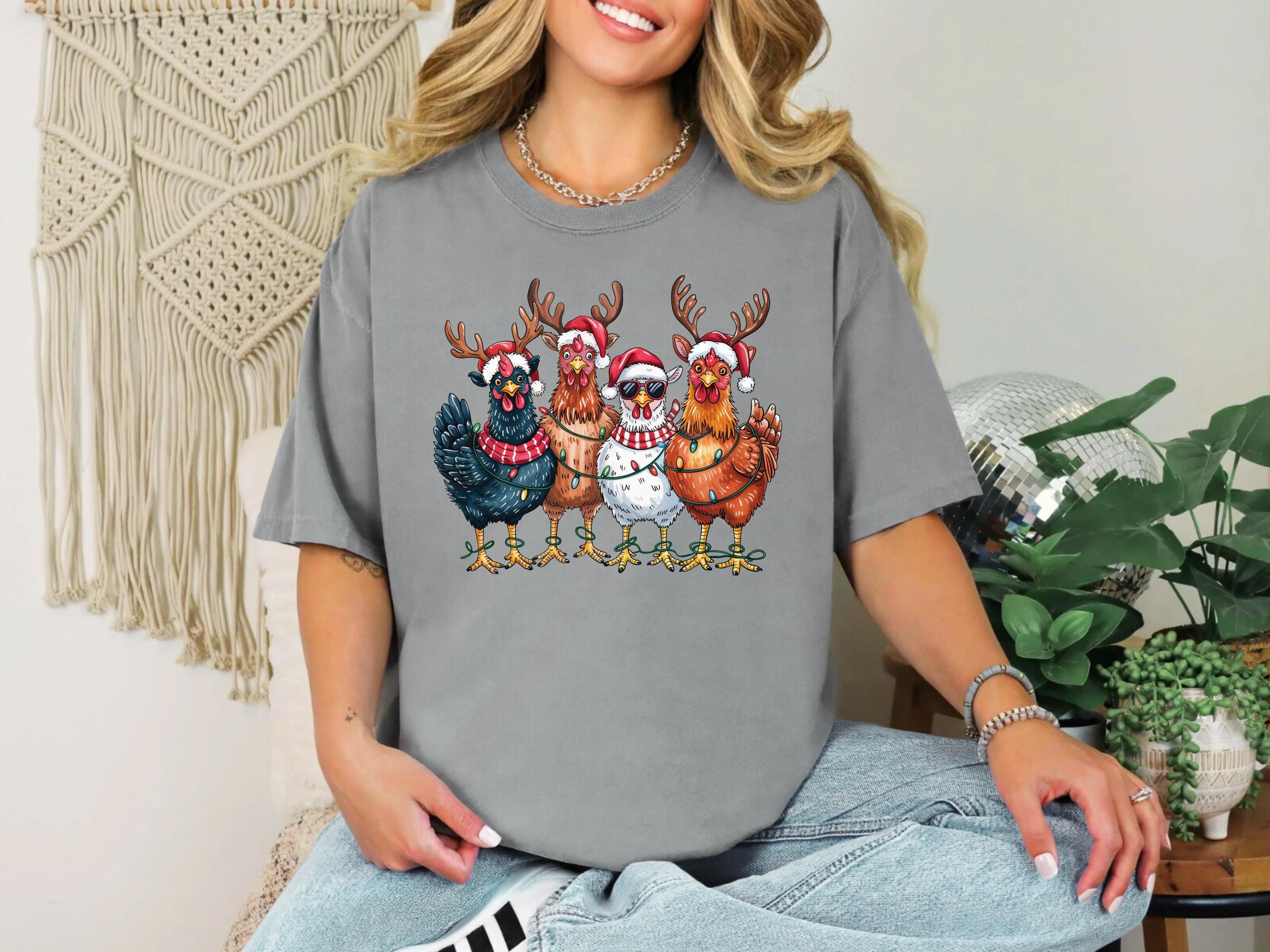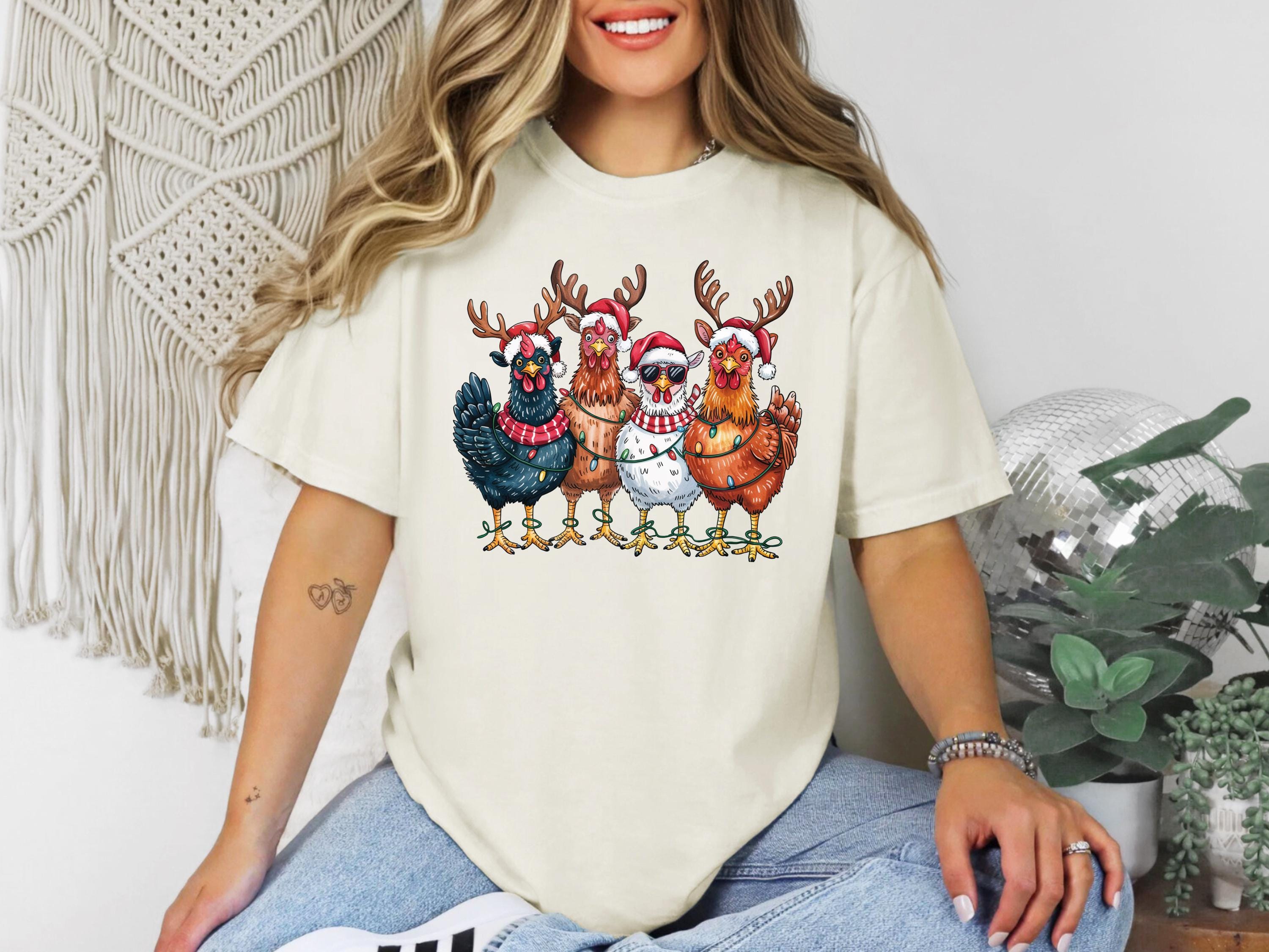Bring holiday cheer with this Funny Christmas Chicken Comfort Colors shirt! Featuring festive chickens with Santa hats, reindeer antlers, and Christmas lights, itโs the perfect holiday farm tee. Great gift for chicken lovers, farmers, and anyone who enjoys a cute and funny Christmas shirt. Ideal for holiday parties or cozy winter outfits.