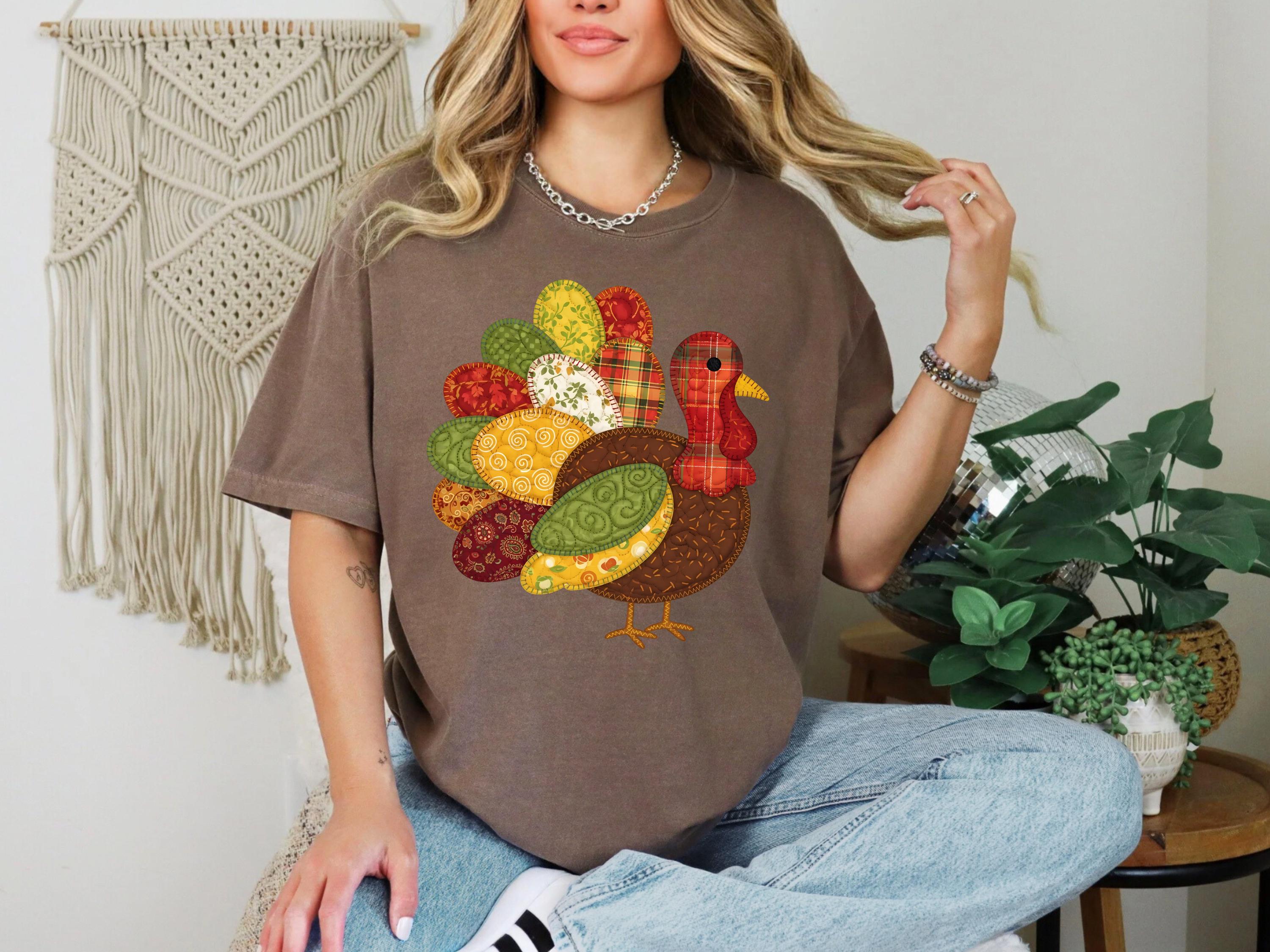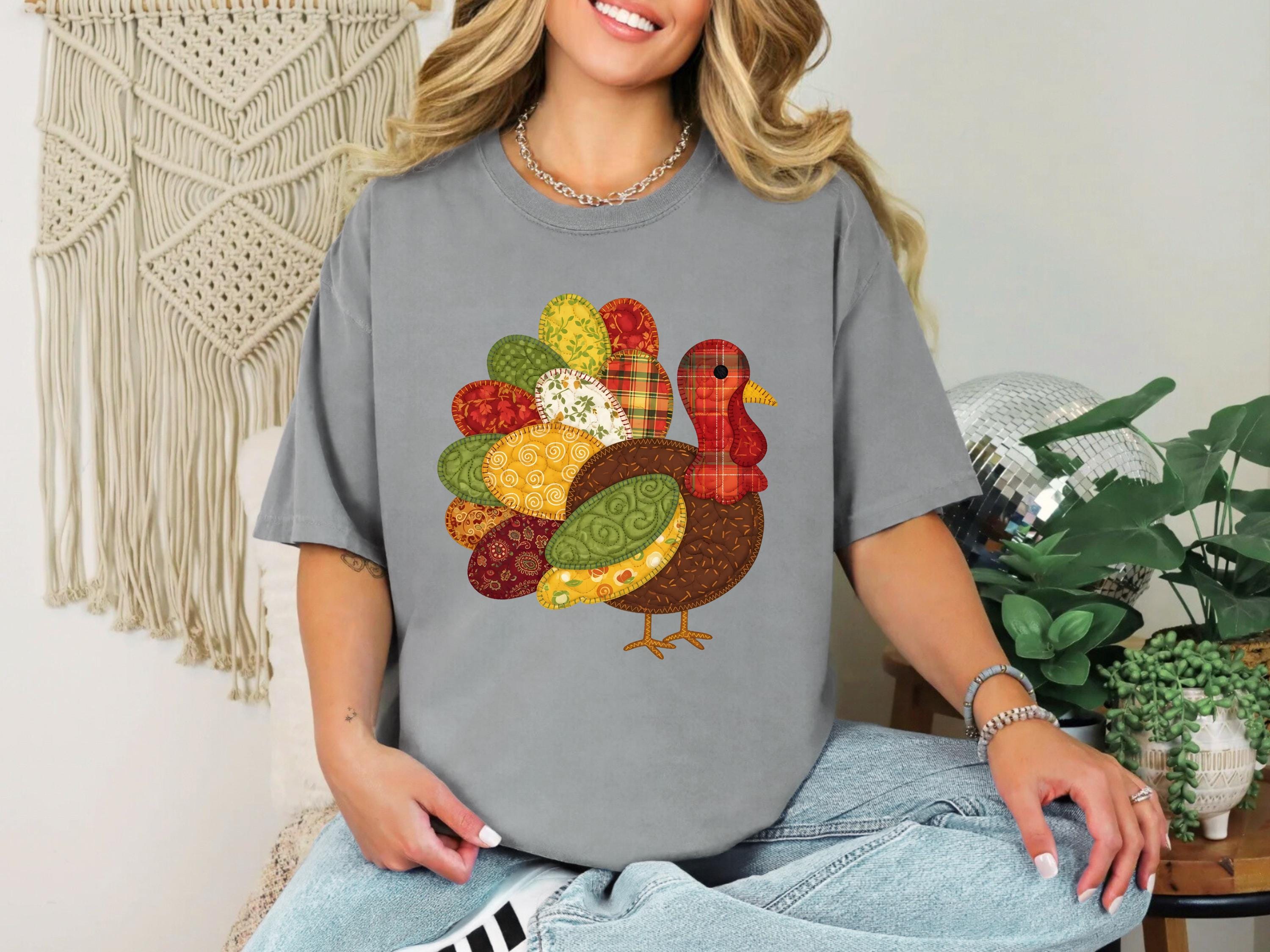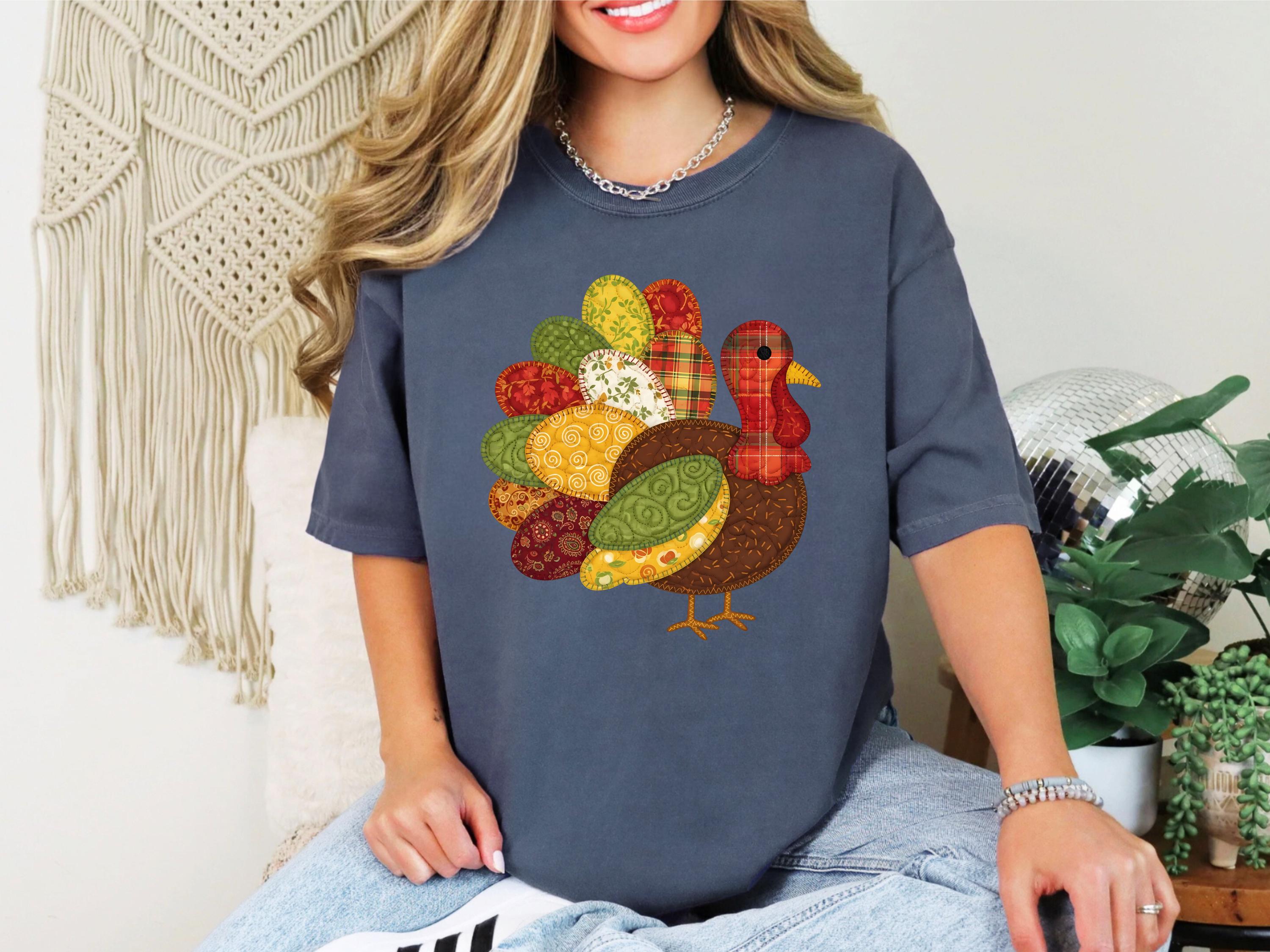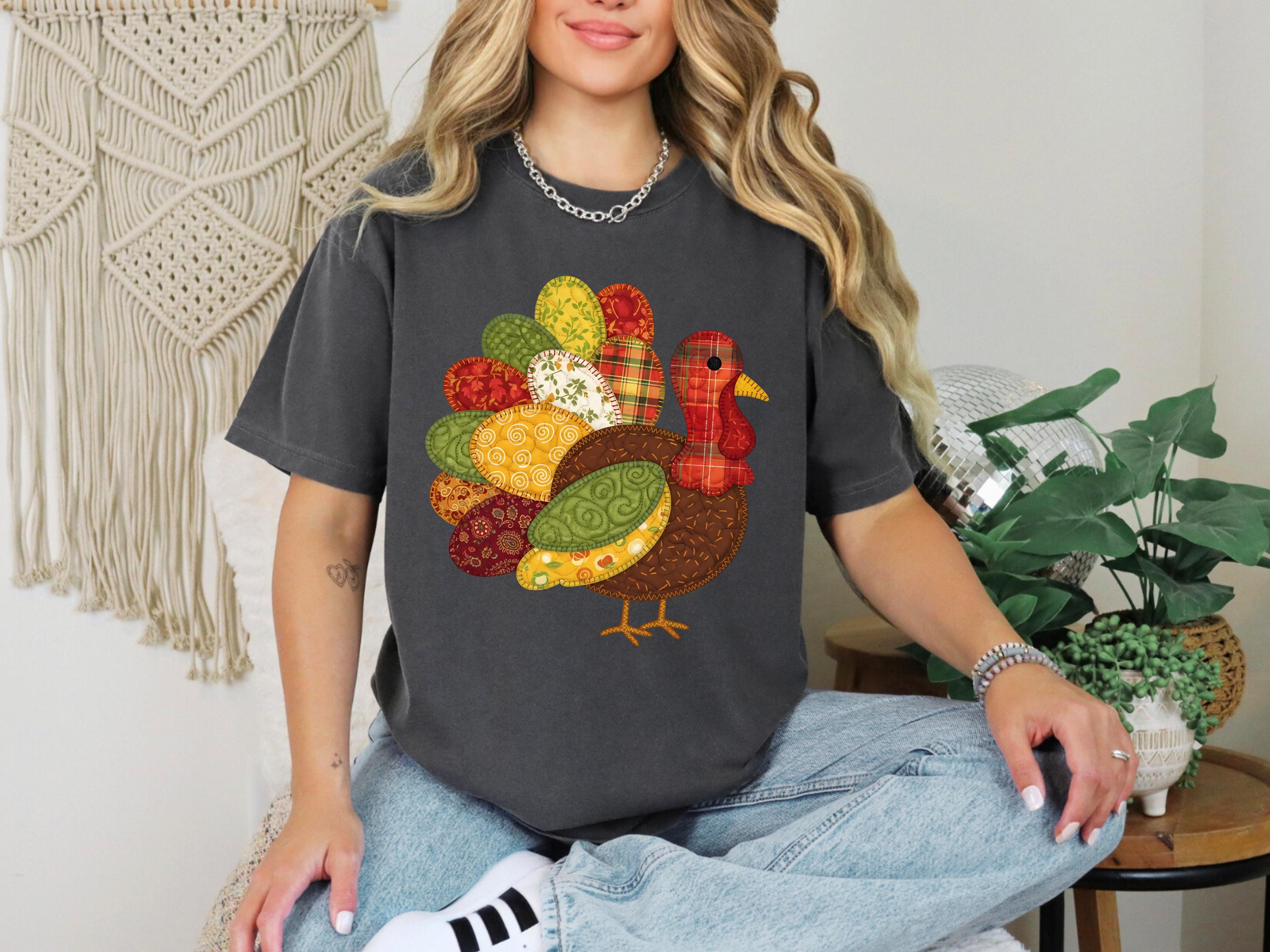 Celebrate Thanksgiving in style with this cute patchwork turkey Comfort Colors T-shirt. ✨ Please note: the design is a printed faux embroidery style, not hand-stitched embroidery. Perfect for holiday gatherings, fall family photos, or as a festive gift. A cozy and fun autumn outfit that looks handmade but is printed for comfort and durability.