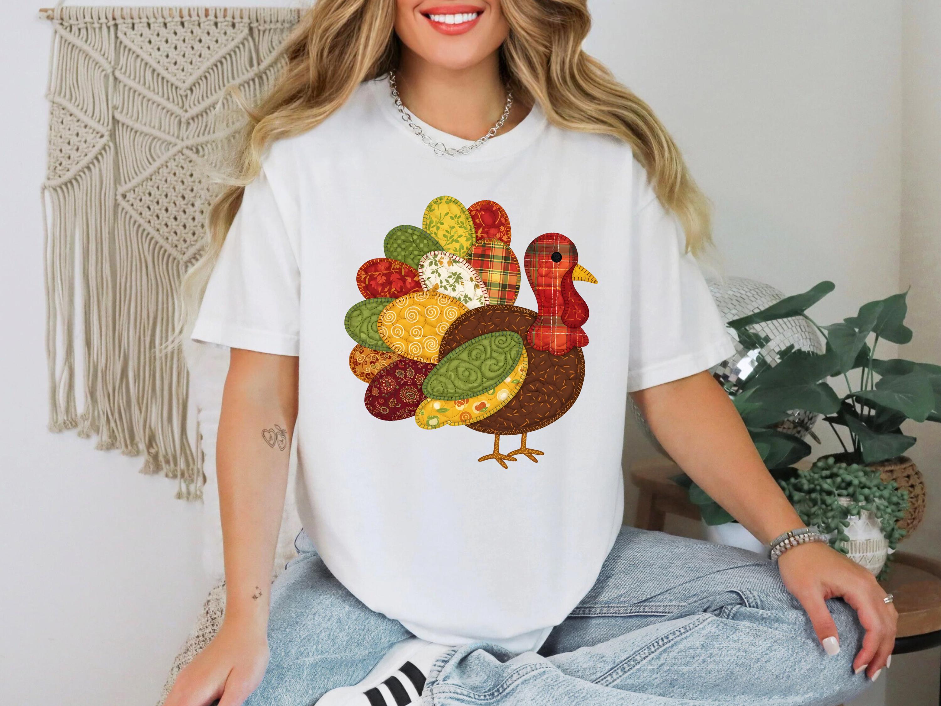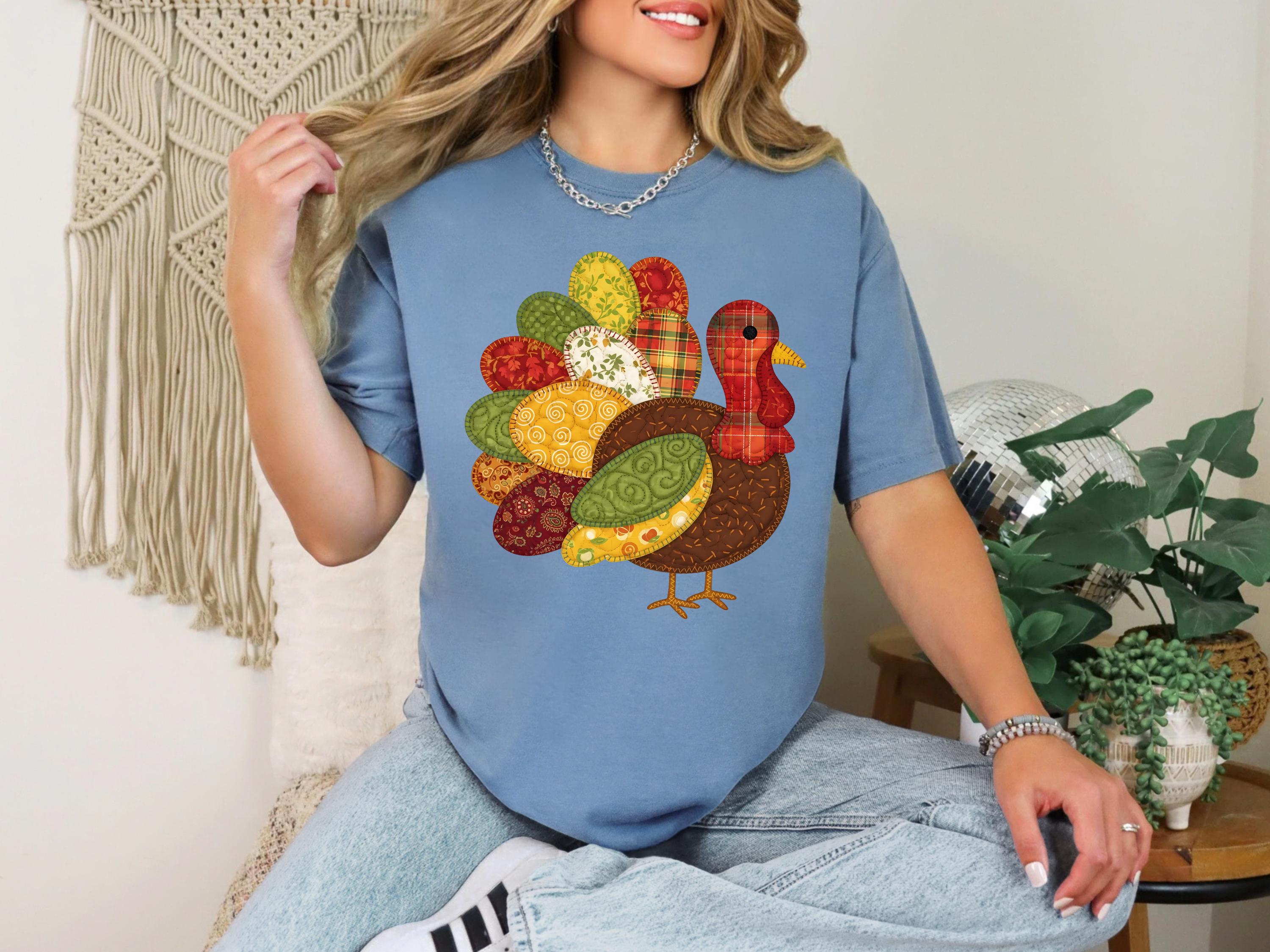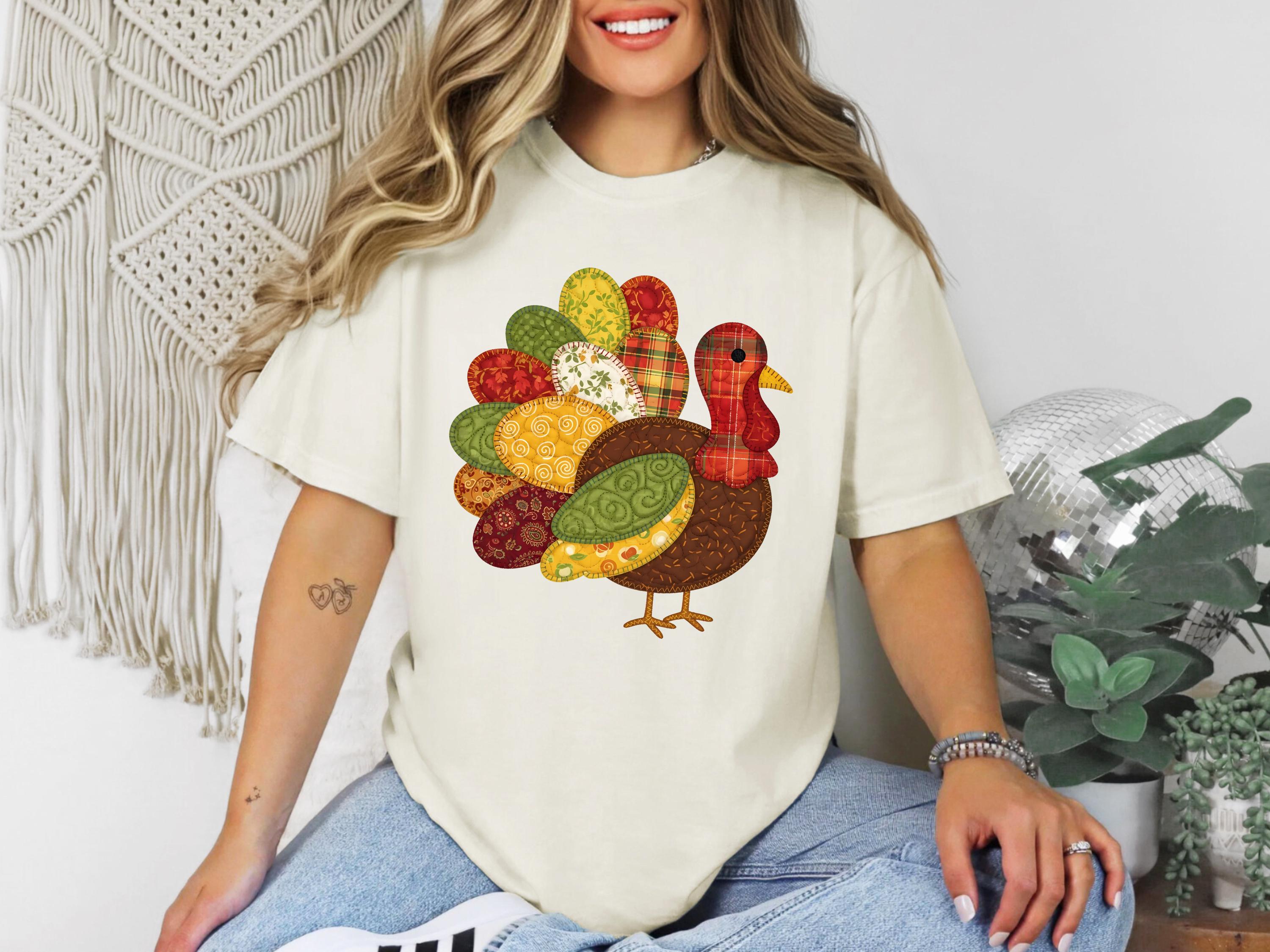 Celebrate Thanksgiving in style with this cute patchwork turkey Comfort Colors T-shirt. ✨ Please note: the design is a printed faux embroidery style, not hand-stitched embroidery. Perfect for holiday gatherings, fall family photos, or as a festive gift. A cozy and fun autumn outfit that looks handmade but is printed for comfort and durability.