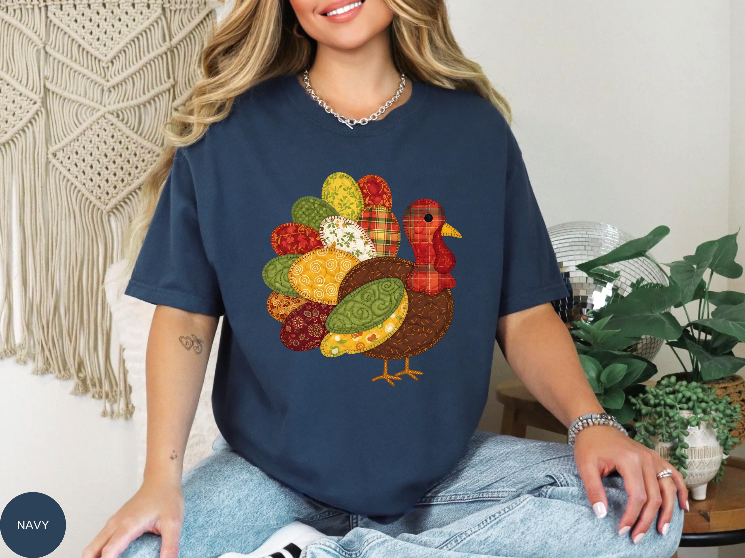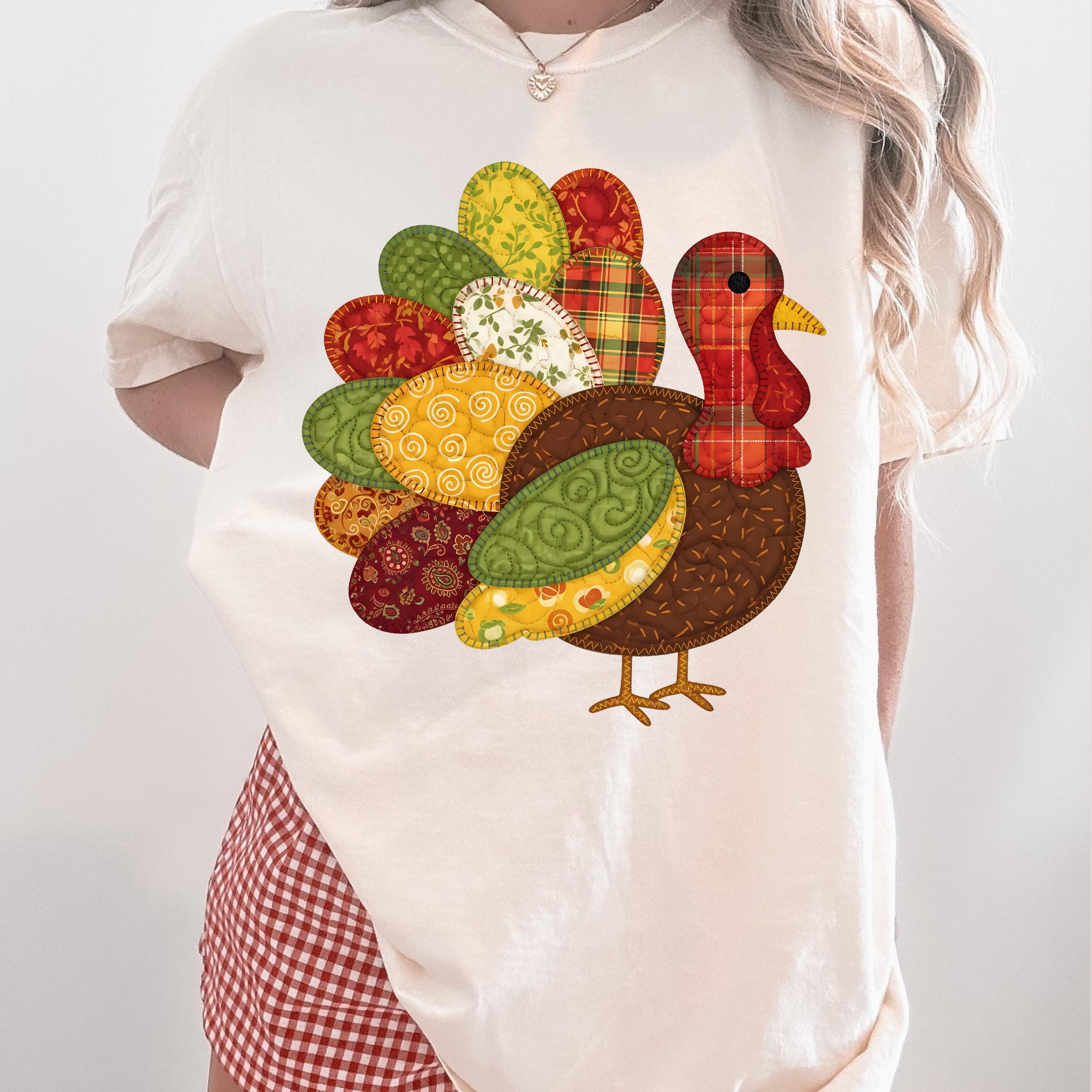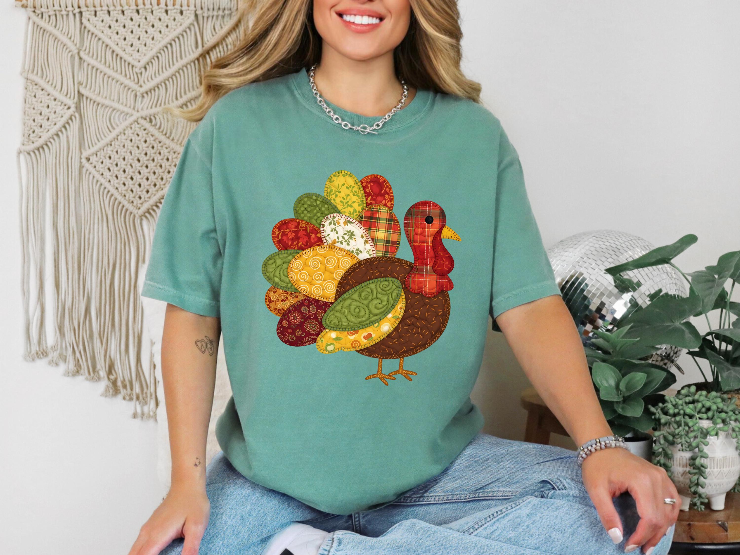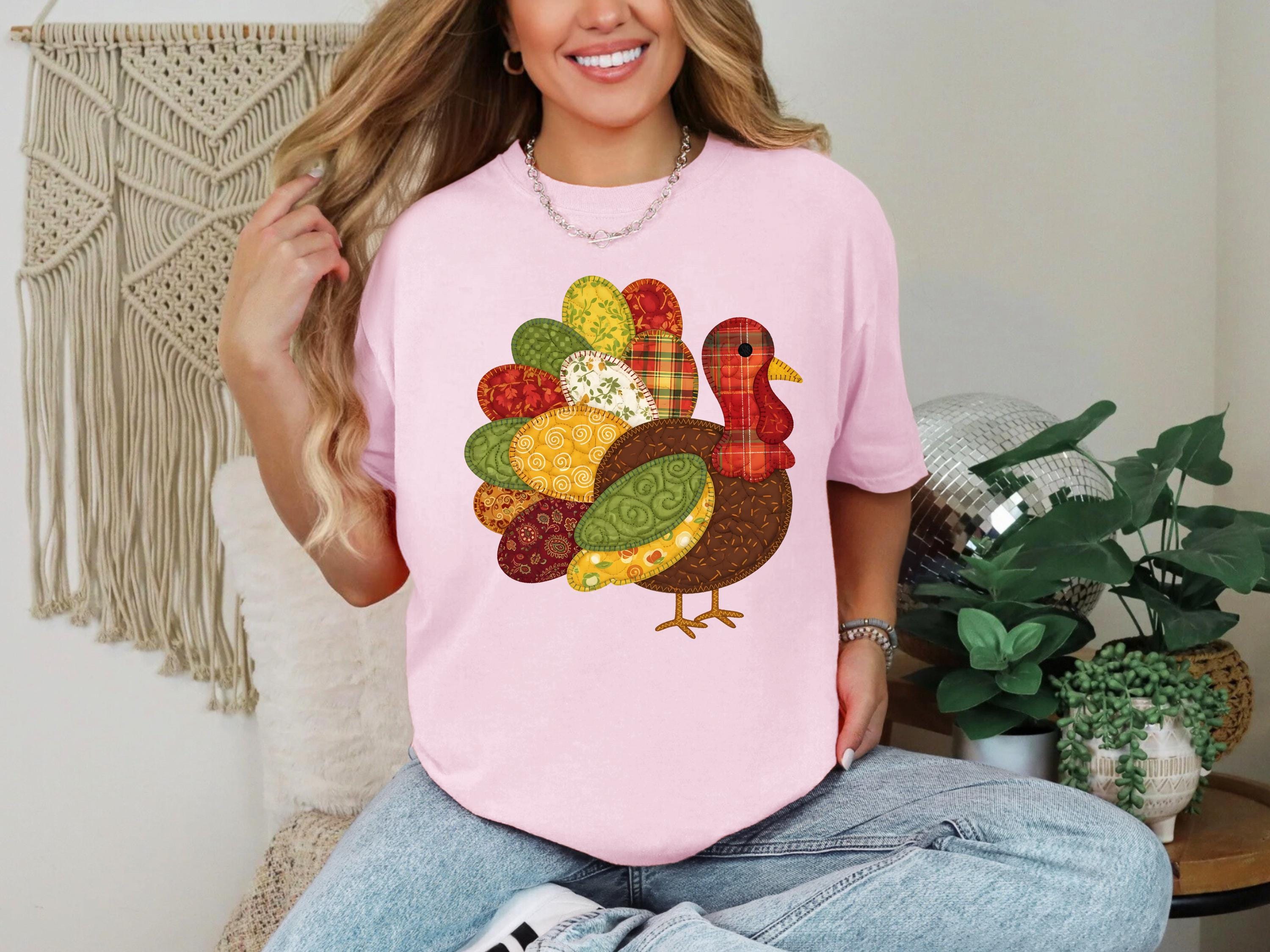 Celebrate Thanksgiving in style with this cute patchwork turkey Comfort Colors T-shirt. ✨ Please note: the design is a printed faux embroidery style, not hand-stitched embroidery. Perfect for holiday gatherings, fall family photos, or as a festive gift. A cozy and fun autumn outfit that looks handmade but is printed for comfort and durability.