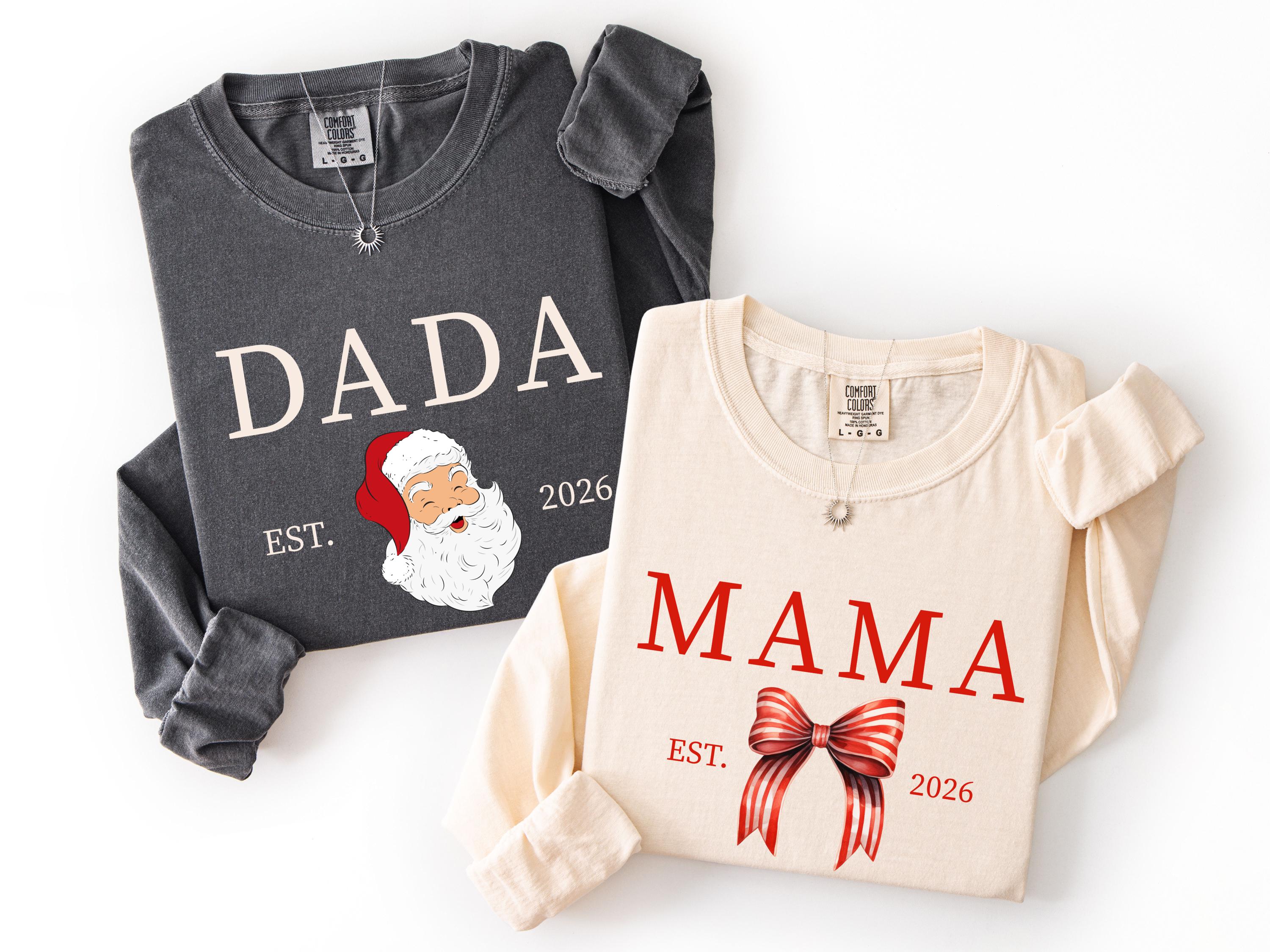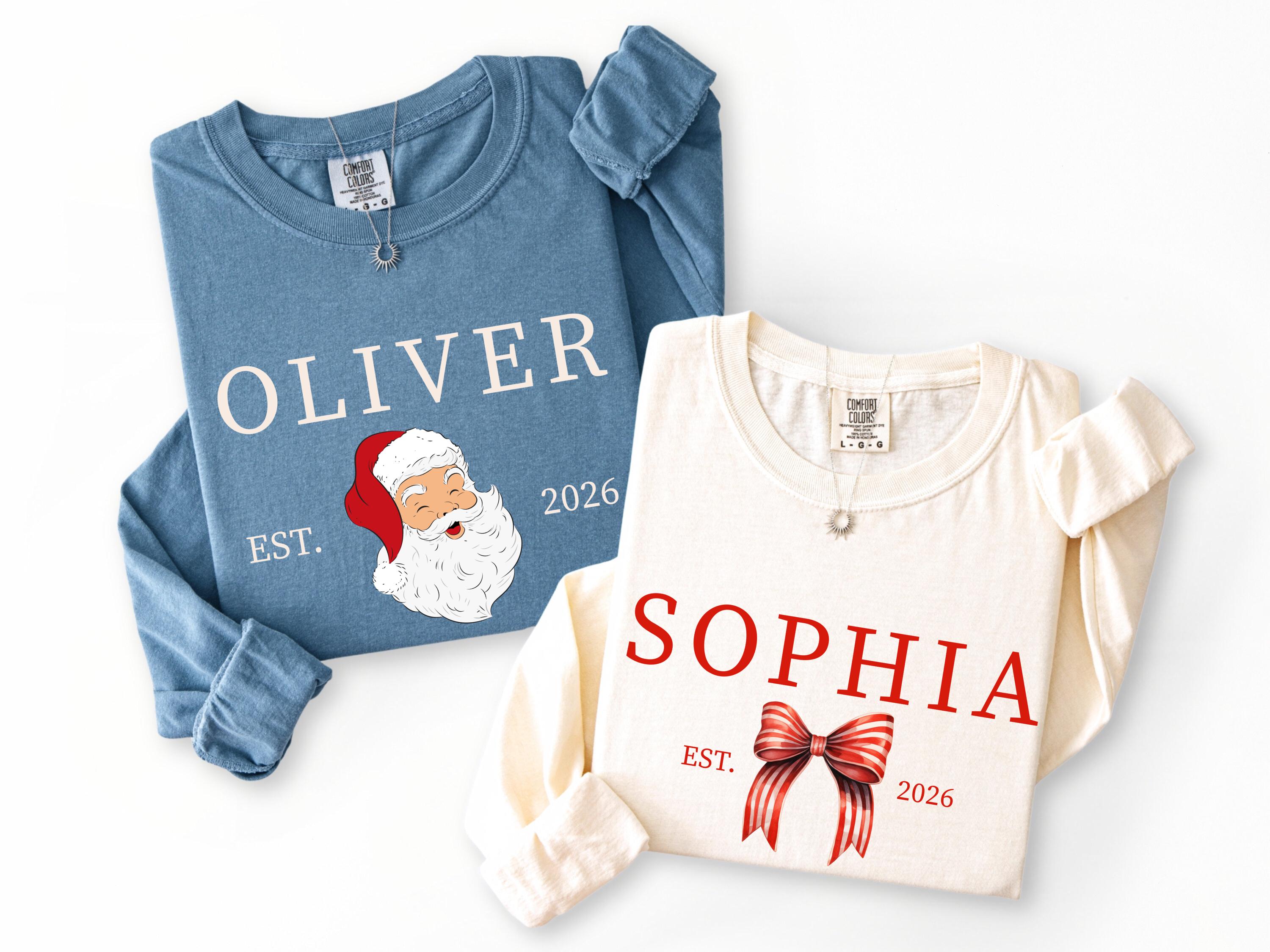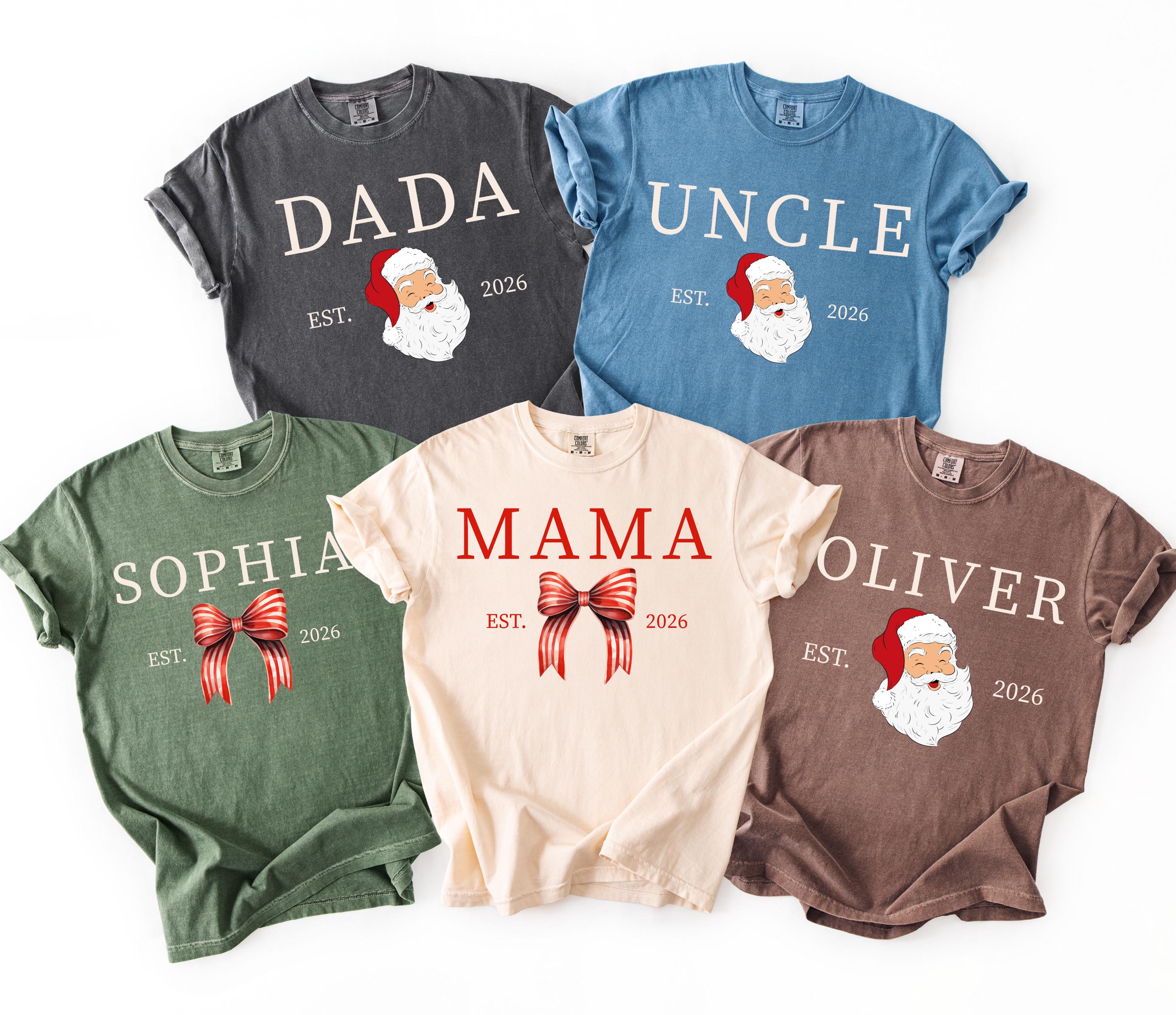 Celebrate Christmas in style with these personalized family Christmas shirts! Custom Comfort Colors® tees with Santa or bow design, perfect for Mama, Dada, kids, and relatives. Create matching holiday shirts for the whole family. A fun Christmas gift idea that makes festive memories even more special!