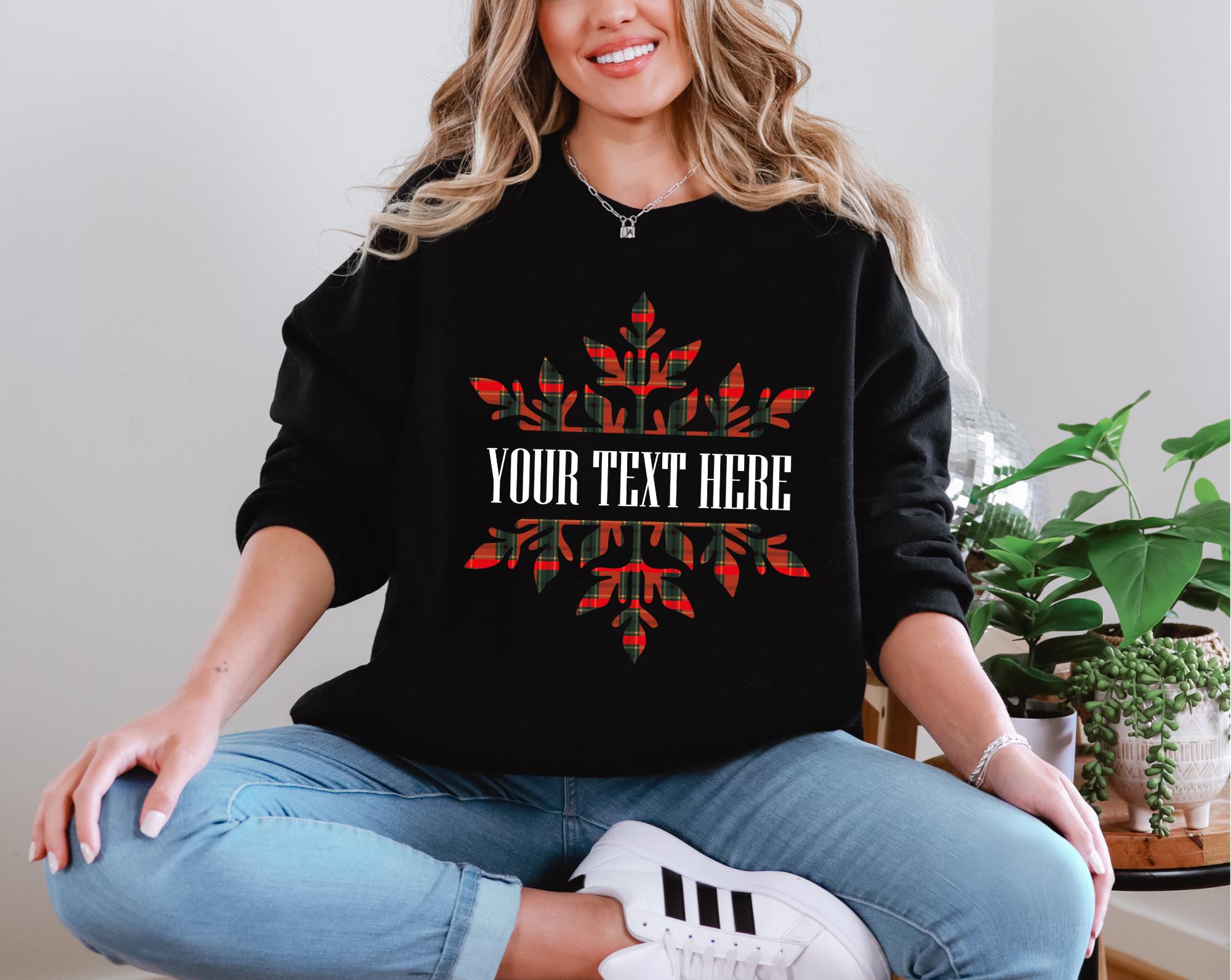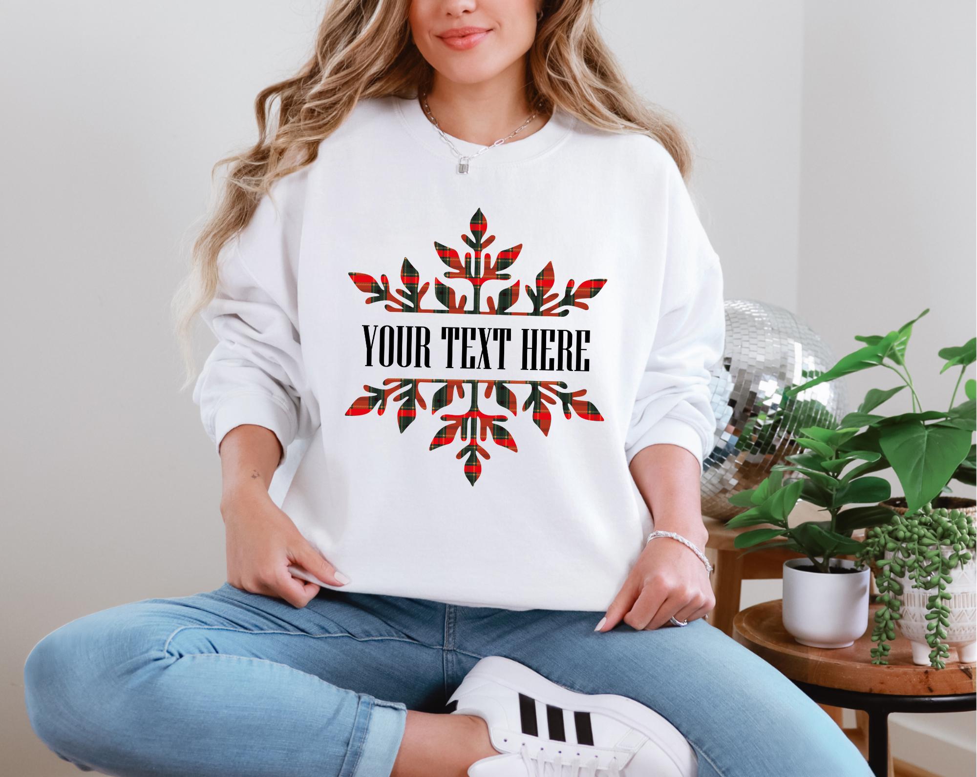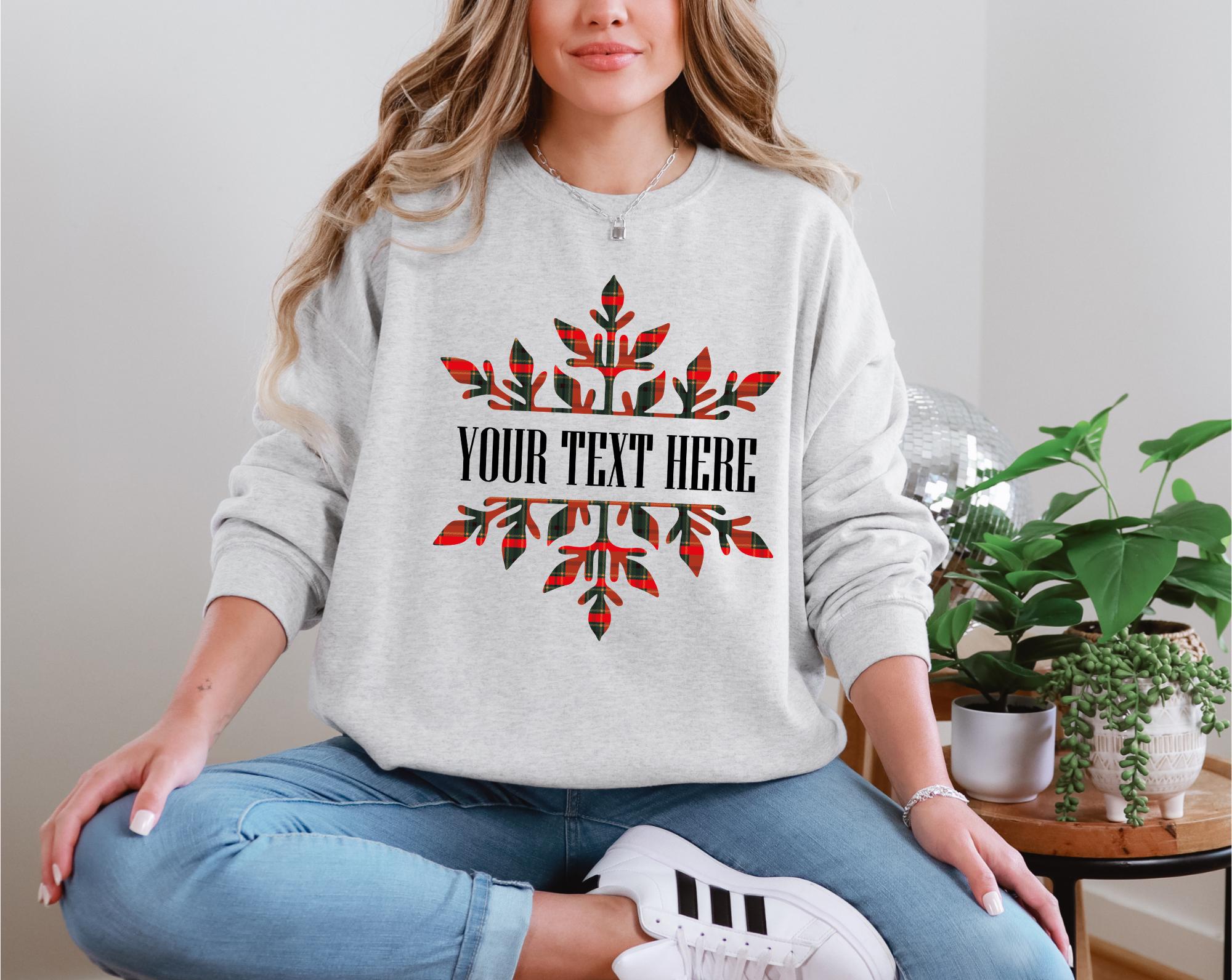 Create your own holiday look with this personalized plaid snowflake design! Add any text you want and make the perfect Christmas shirt or cozy sweatshirt.