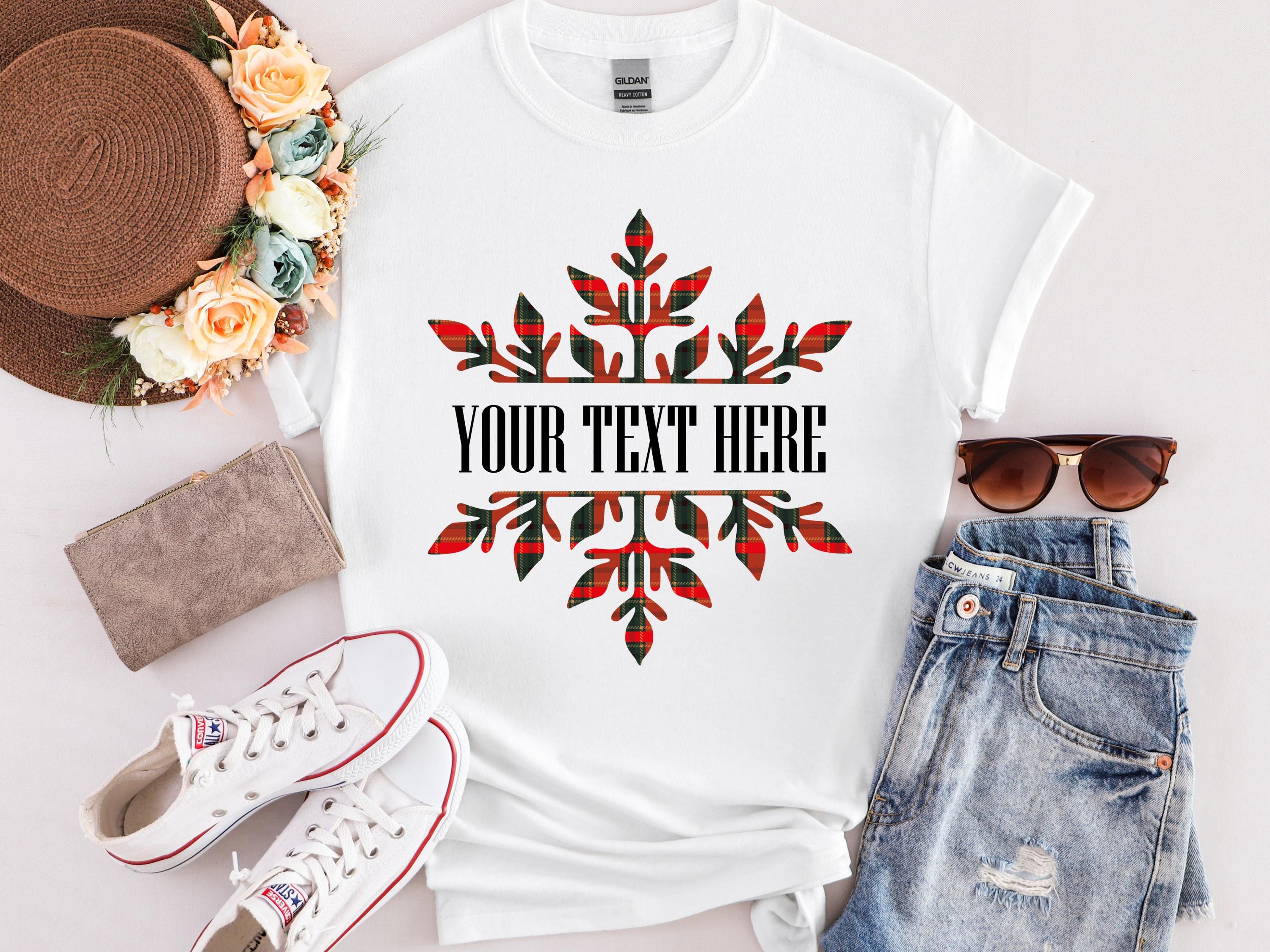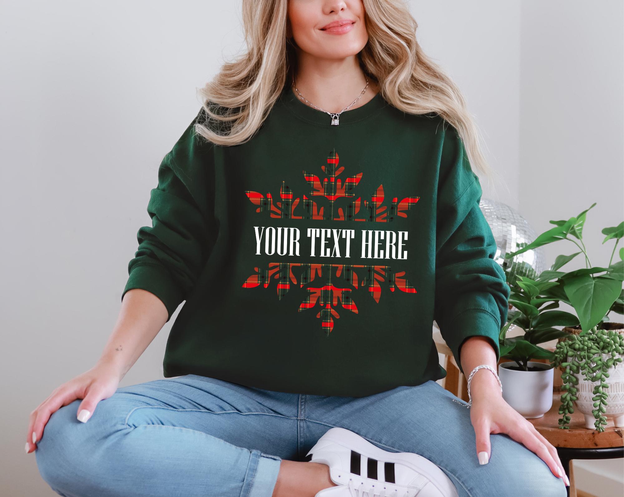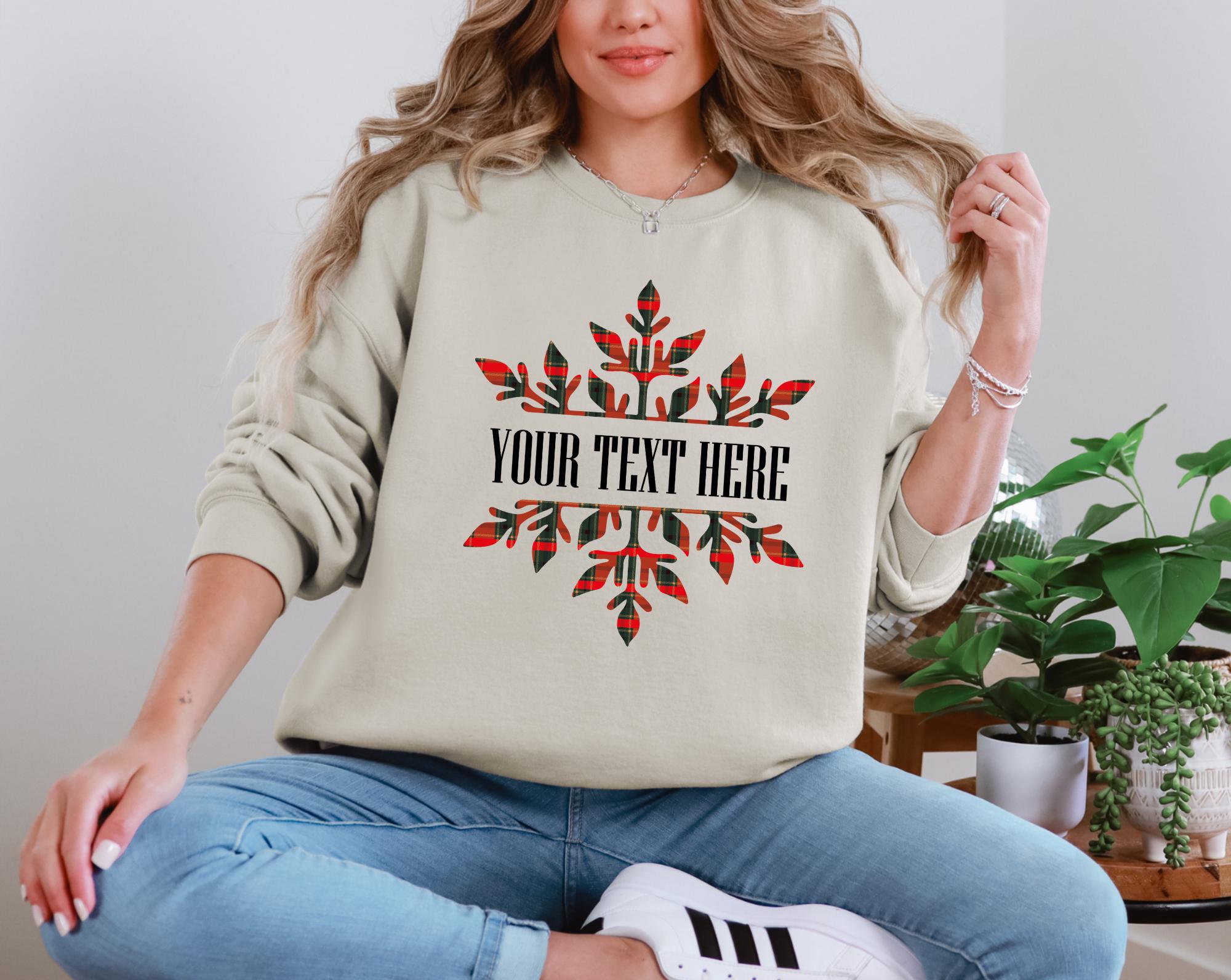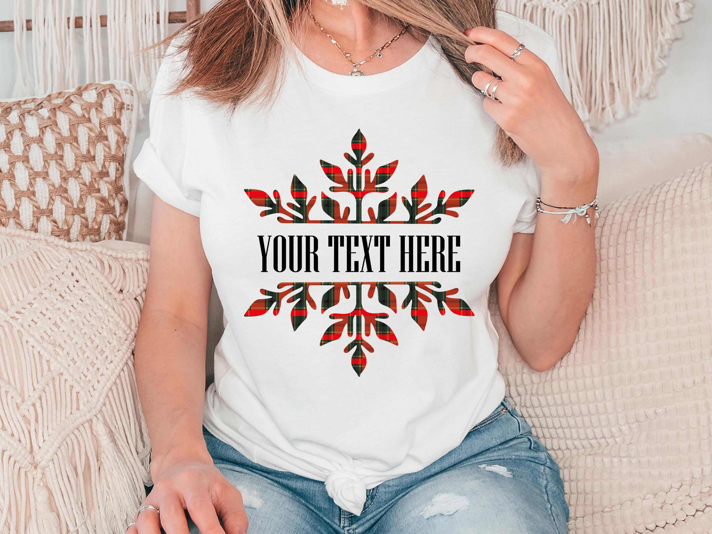 Create your own holiday look with this personalized plaid snowflake design! Add any text you want and make the perfect Christmas shirt or cozy sweatshirt.