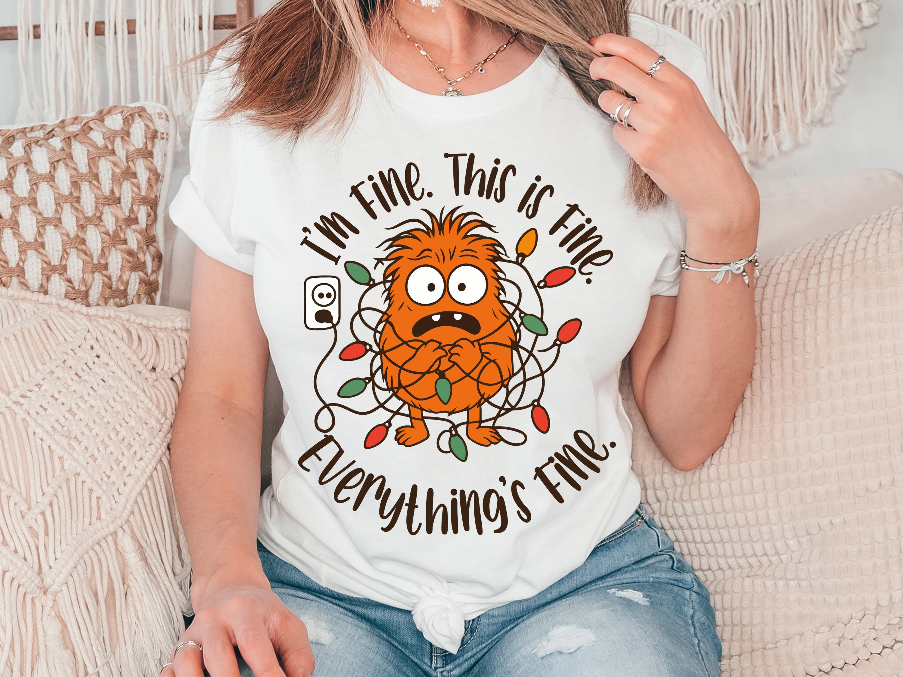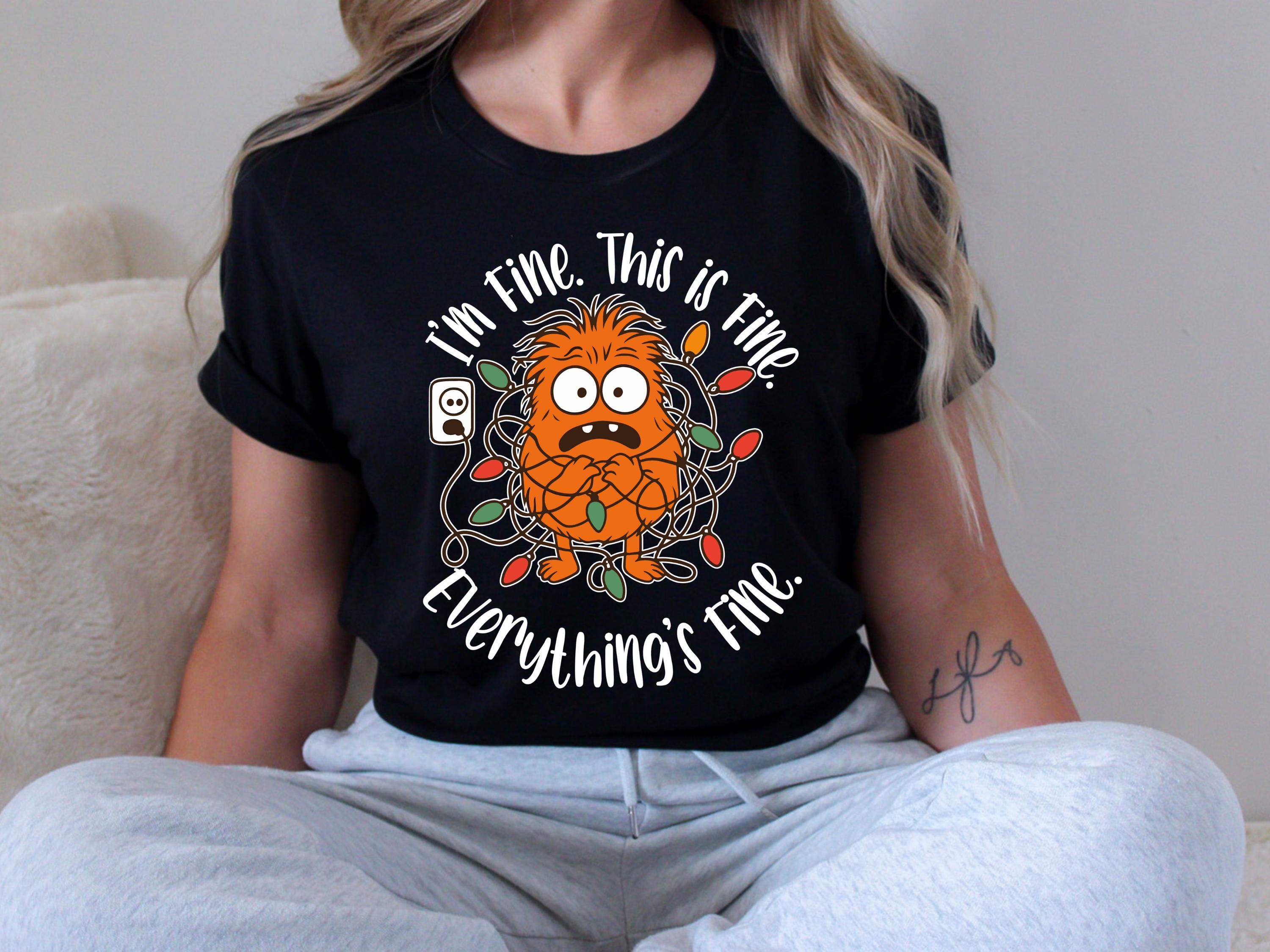 This “I’m Fine. This is Fine. Everything’s Fine.” Christmas design is the perfect funny holiday stress shirt for anyone who feels the chaos of the season. Featuring an adorable tangled Christmas lights character and playful distressed comic style artwork, this tee captures the hilarious holiday meltdown mood perfectly.