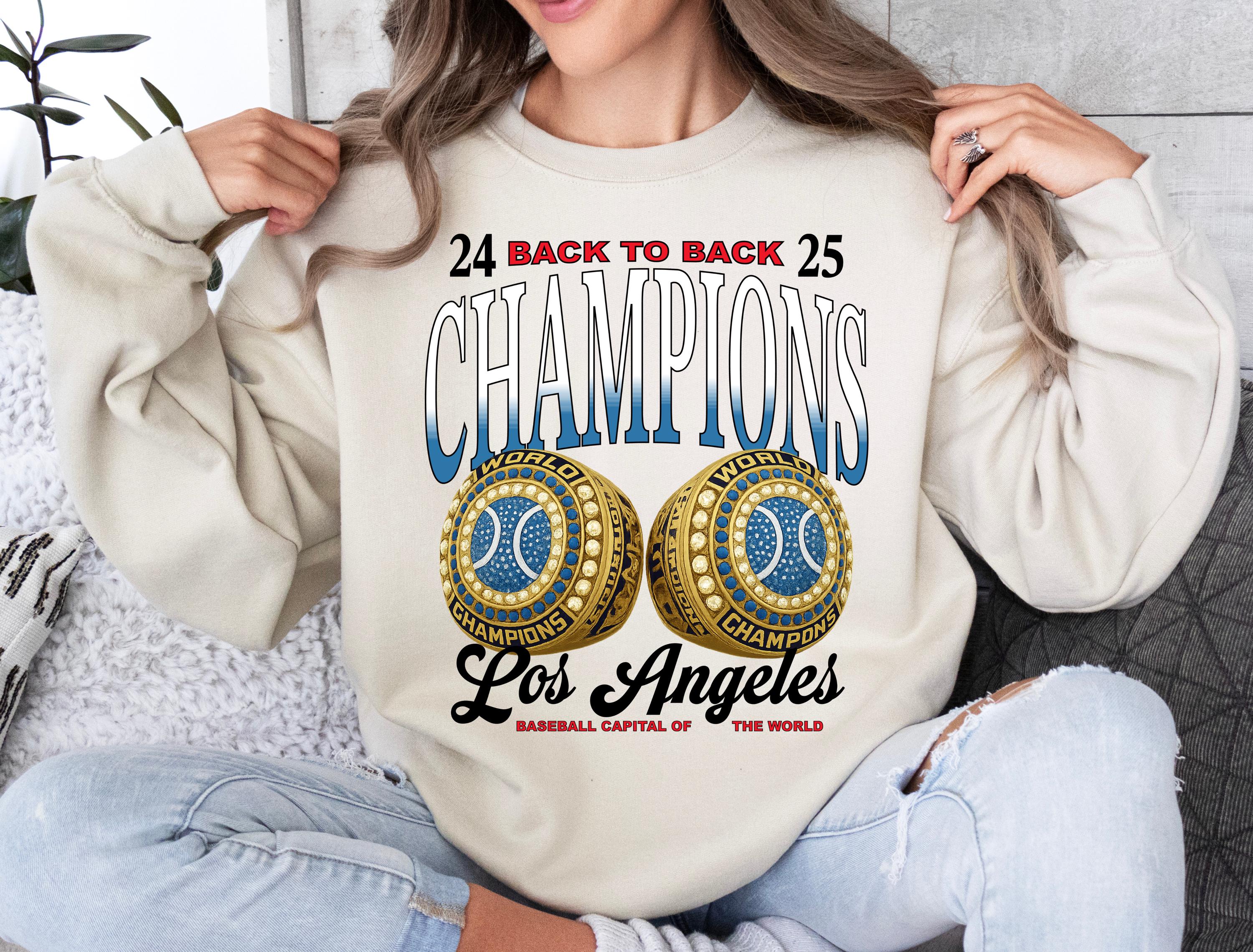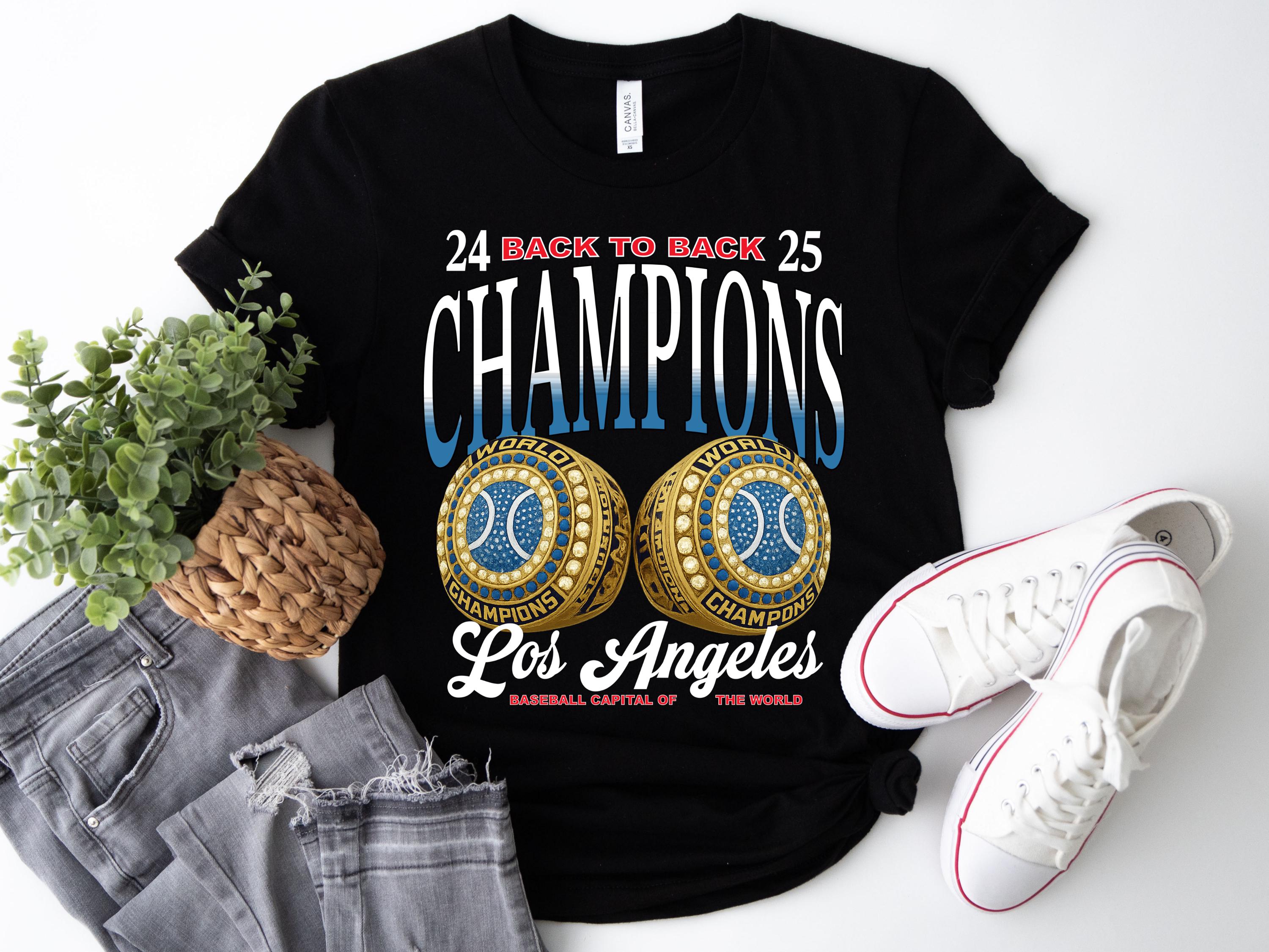 Celebrate the excitement of back-to-back championship wins with this bold retro “Champions” design featuring detailed championship ring artwork and Los Angeles pride style lettering. Perfect for baseball fans, game-day outfits, and anyone who loves supporting their city with style.