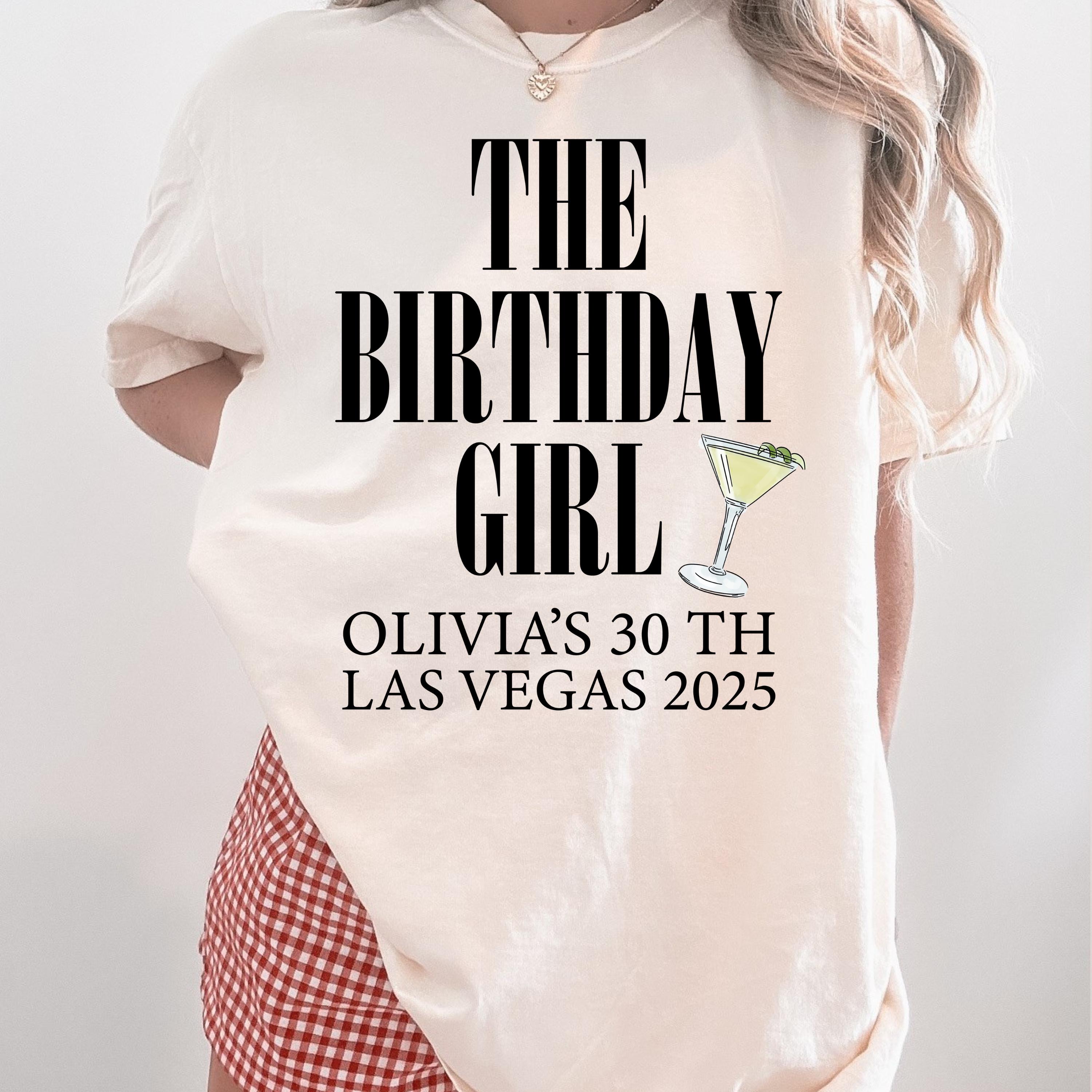 This “The Birthday Girl” custom tee is the perfect matching shirt for bachelorette trips, girls trips, and birthday weekend celebrations. Designed with a chic modern font and martini glass graphic, this tee adds a fun and stylish touch to the party vibe. Available on soft premium Comfort Colors tees and customizable with name, age, city, and year (Vegas, Miami, Nashville, etc.), it’s ideal for unforgettable birthday trip photos and group outfits.