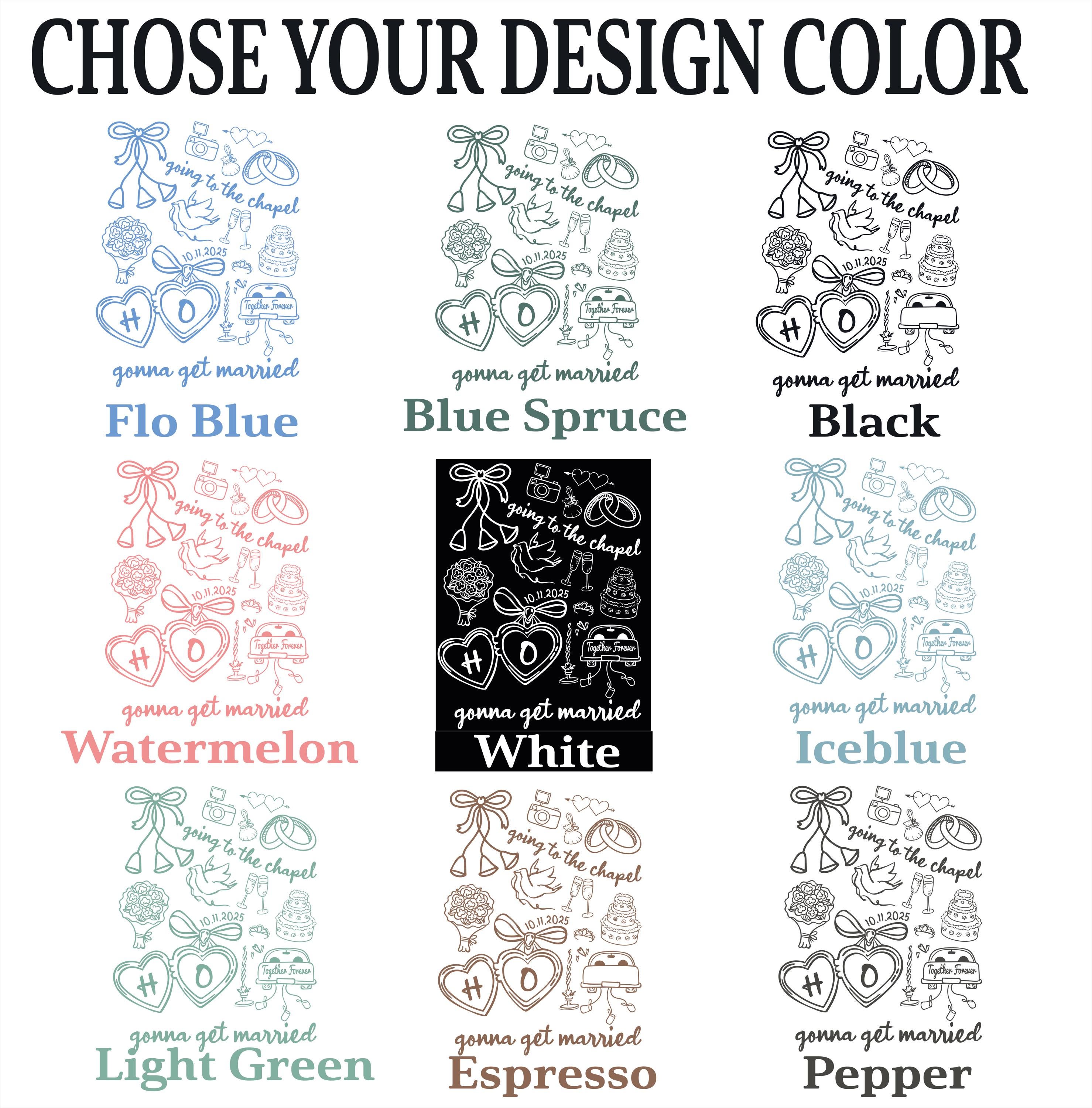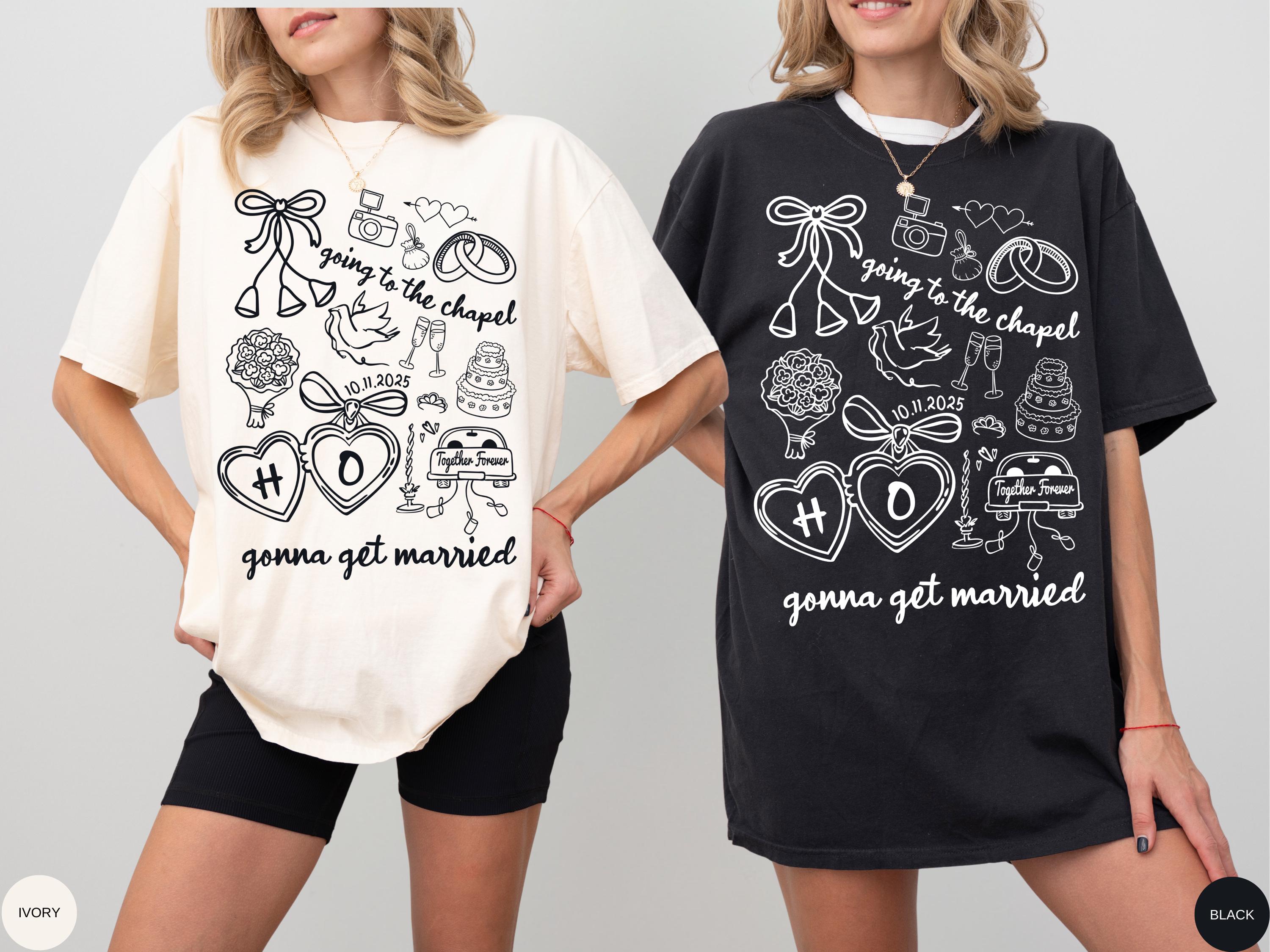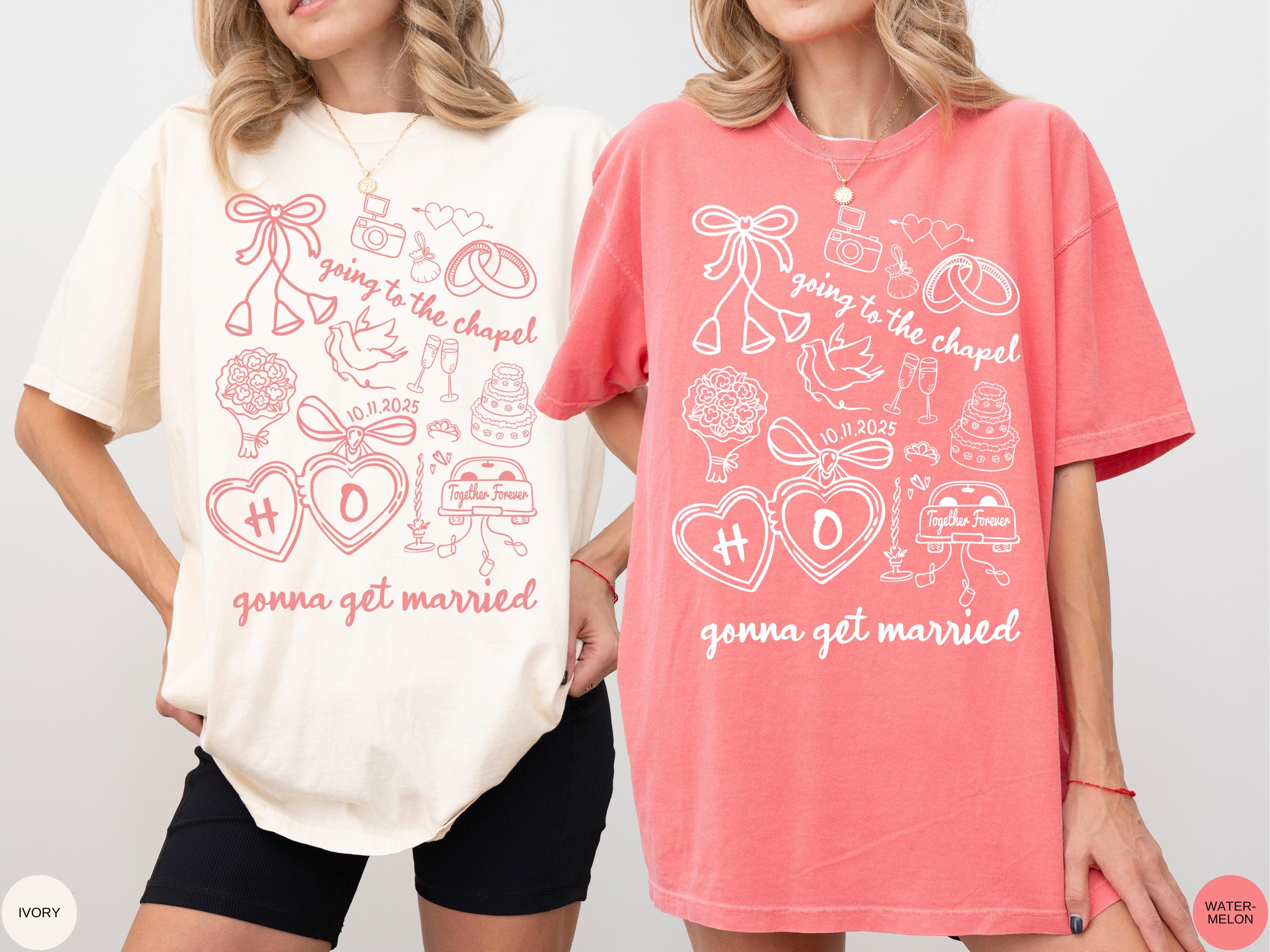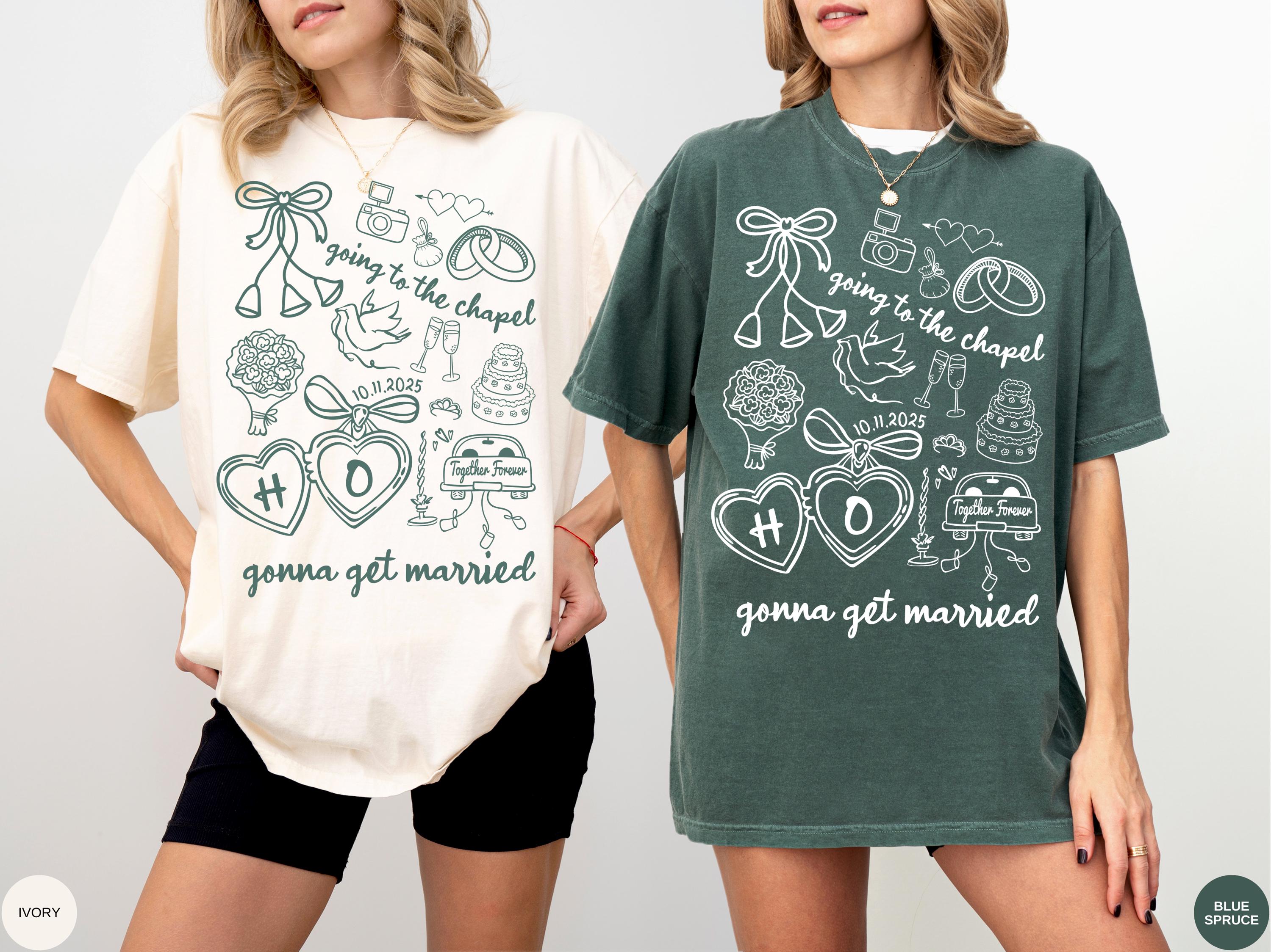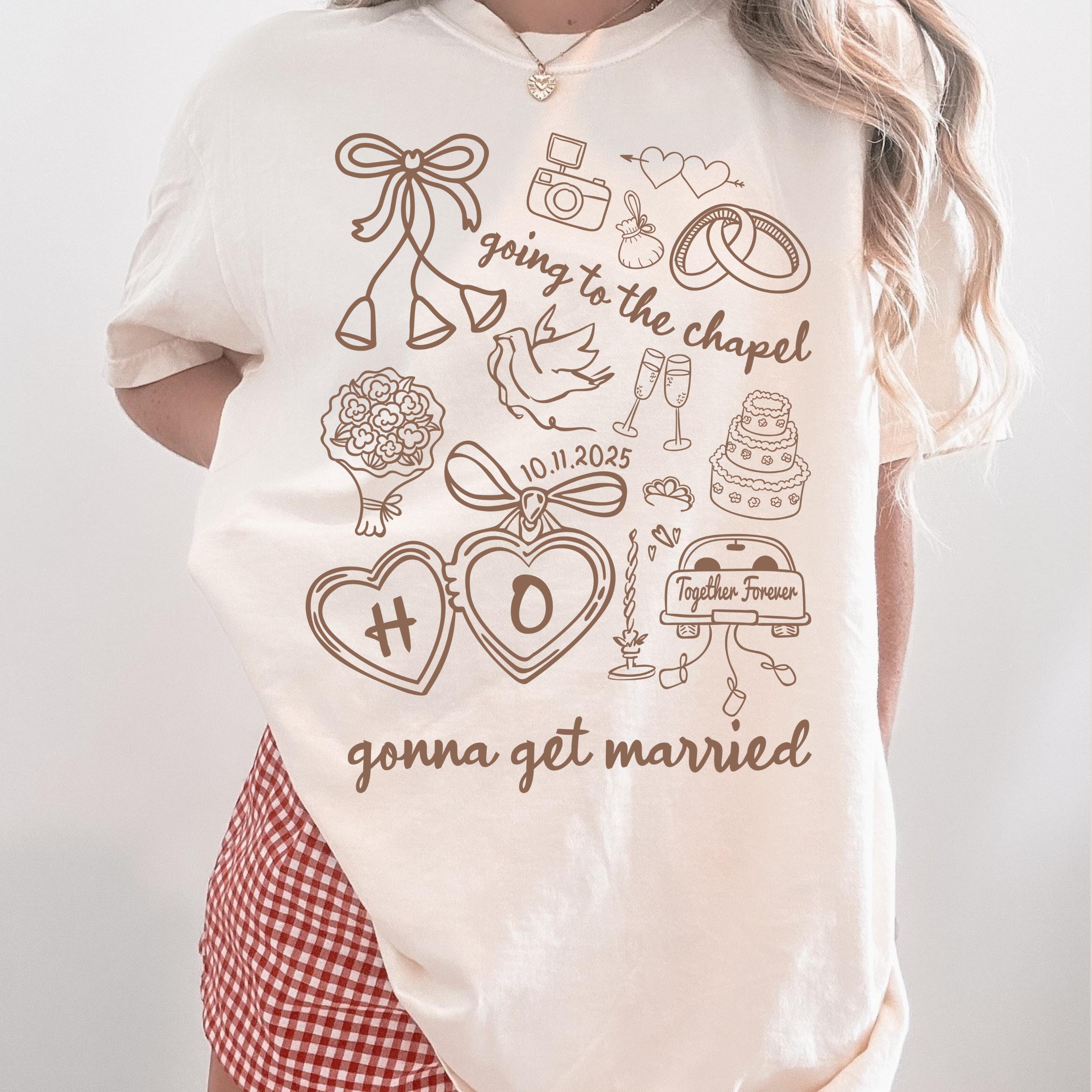 This “Going to the Chapel” personalized wedding t-shirt is perfect for brides, bridal parties, and bachelorette trip celebrations. Designed with cute hand-drawn wedding icons, customizable initials and wedding date, this tee is a beautiful way to celebrate the excitement of getting married. Printed on premium Comfort Colors for a soft, relaxed, high-quality look that photographs beautifully for wedding weekend pictures.
