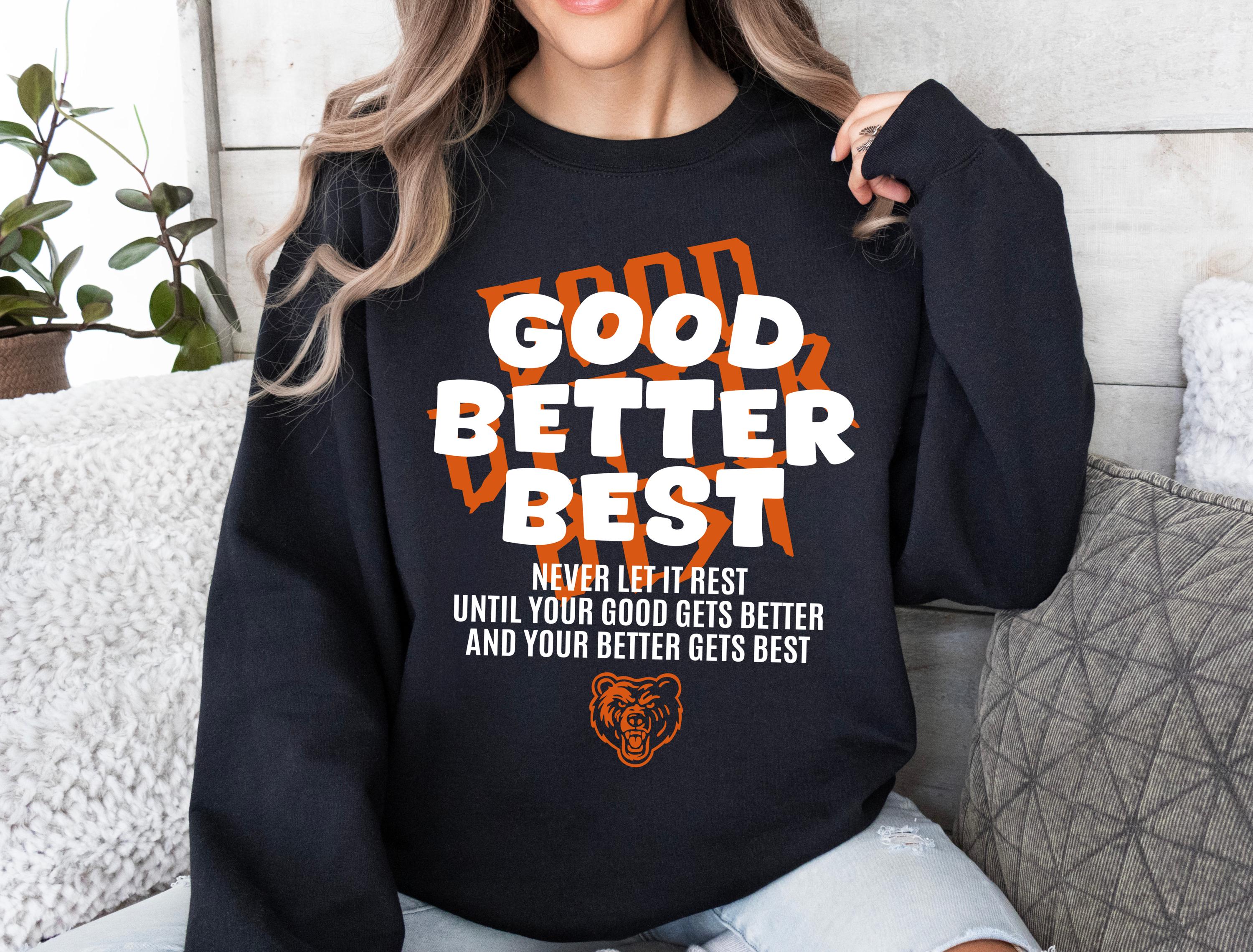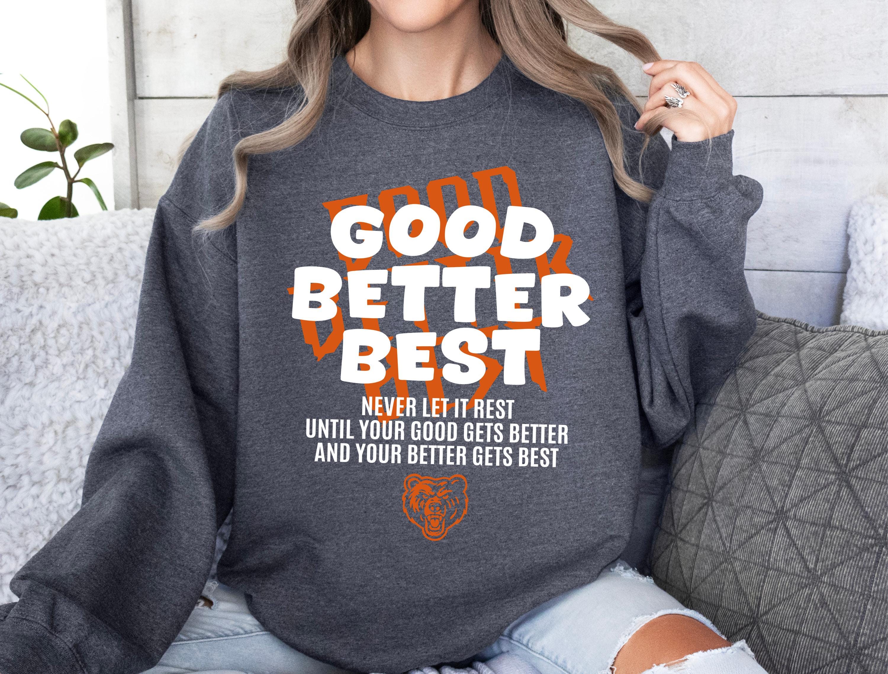 Featuring the iconic motivational quote "Good, Better, Best - Never Let It Rest," this design combines classic retro sportswear vibes with a powerful message. It is the ultimate game day outfit for passionate fans who want to stay warm and stylish. Grab this as a thoughtful gift for the football lover in your life, or treat yourself to a new lucky shirt for the season. Available as a comfy tee, warm hoodie, or classic sweatshirt to suit every fan's style.