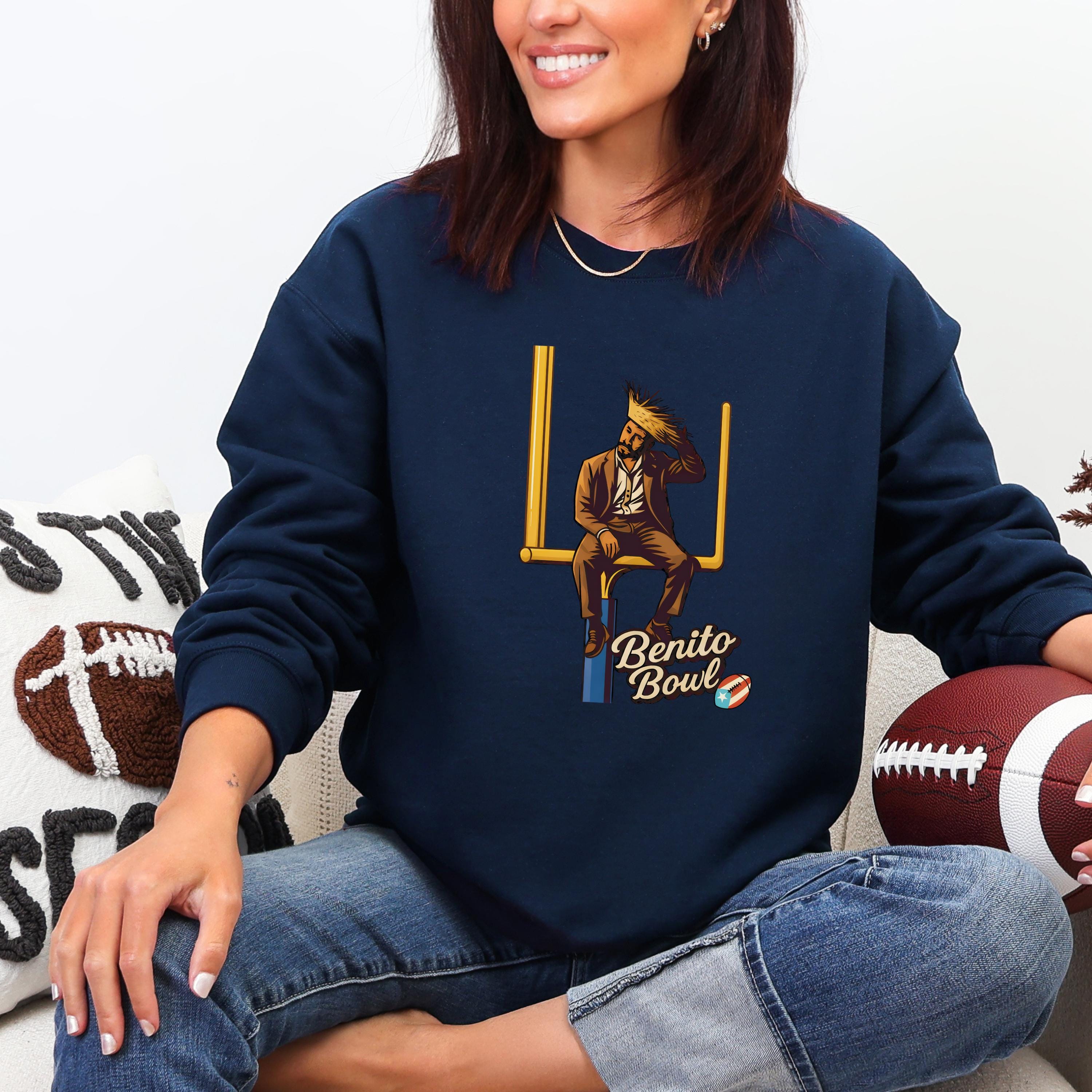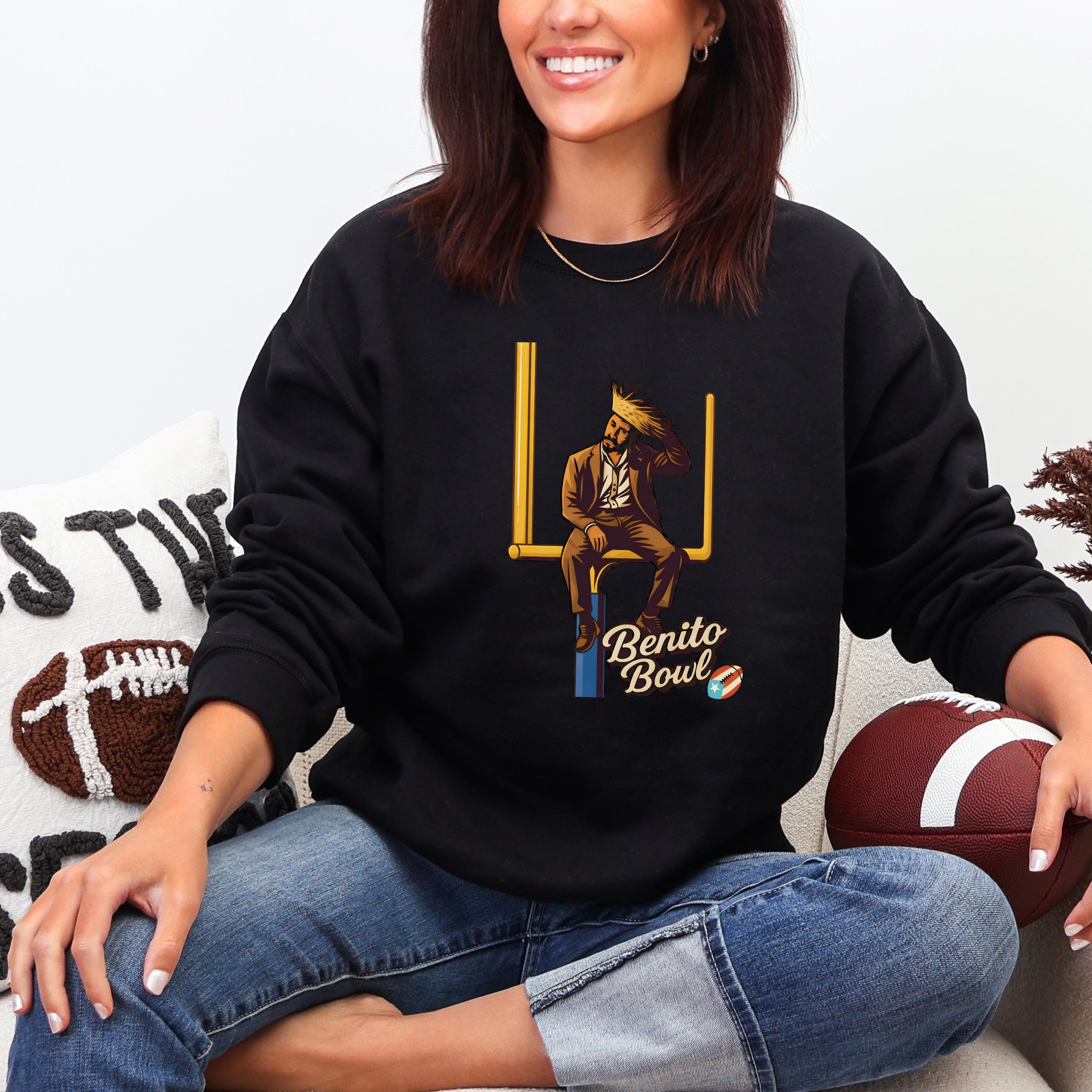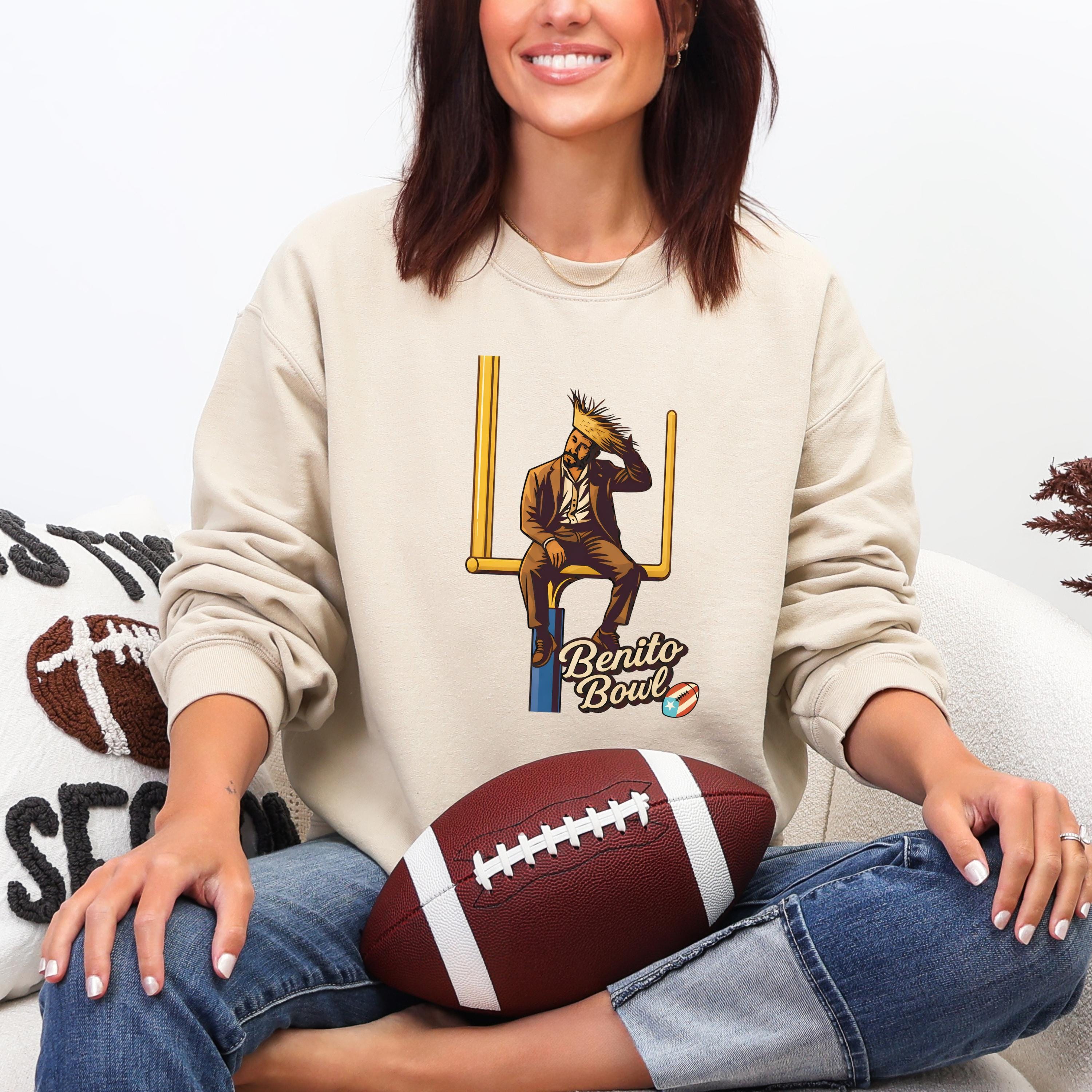 Get ready for the ultimate game day experience with this Benito Bowl graphic sweatshirt, blending Latin music culture with funny football excitement. This cozy pullover features a unique illustration of your favorite Puerto Rican artist sitting on a goal post, making it the perfect gift for music lovers and sports fans.
