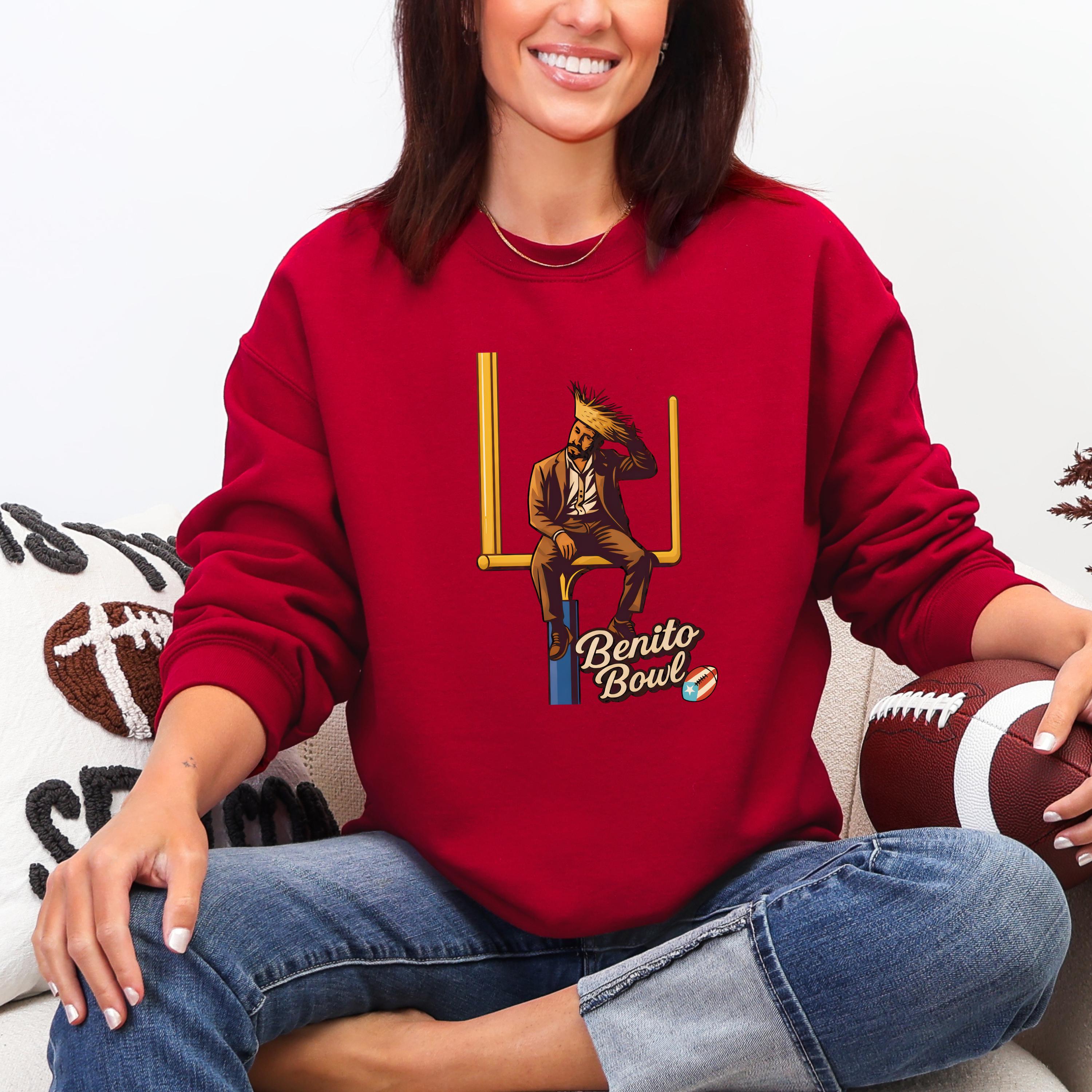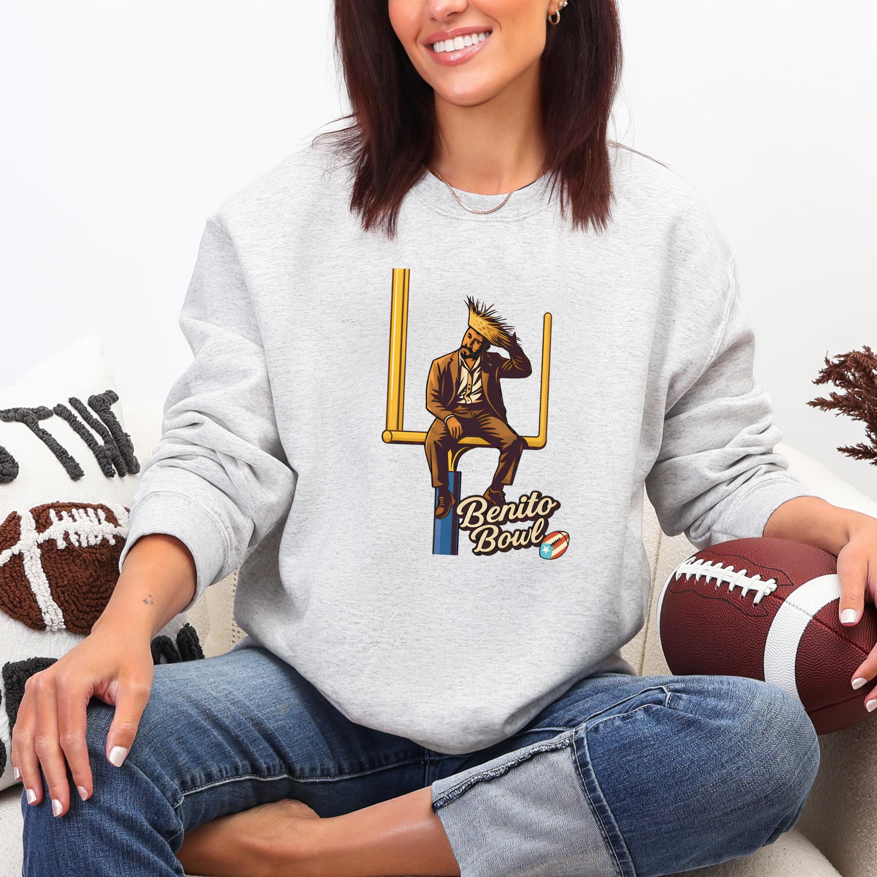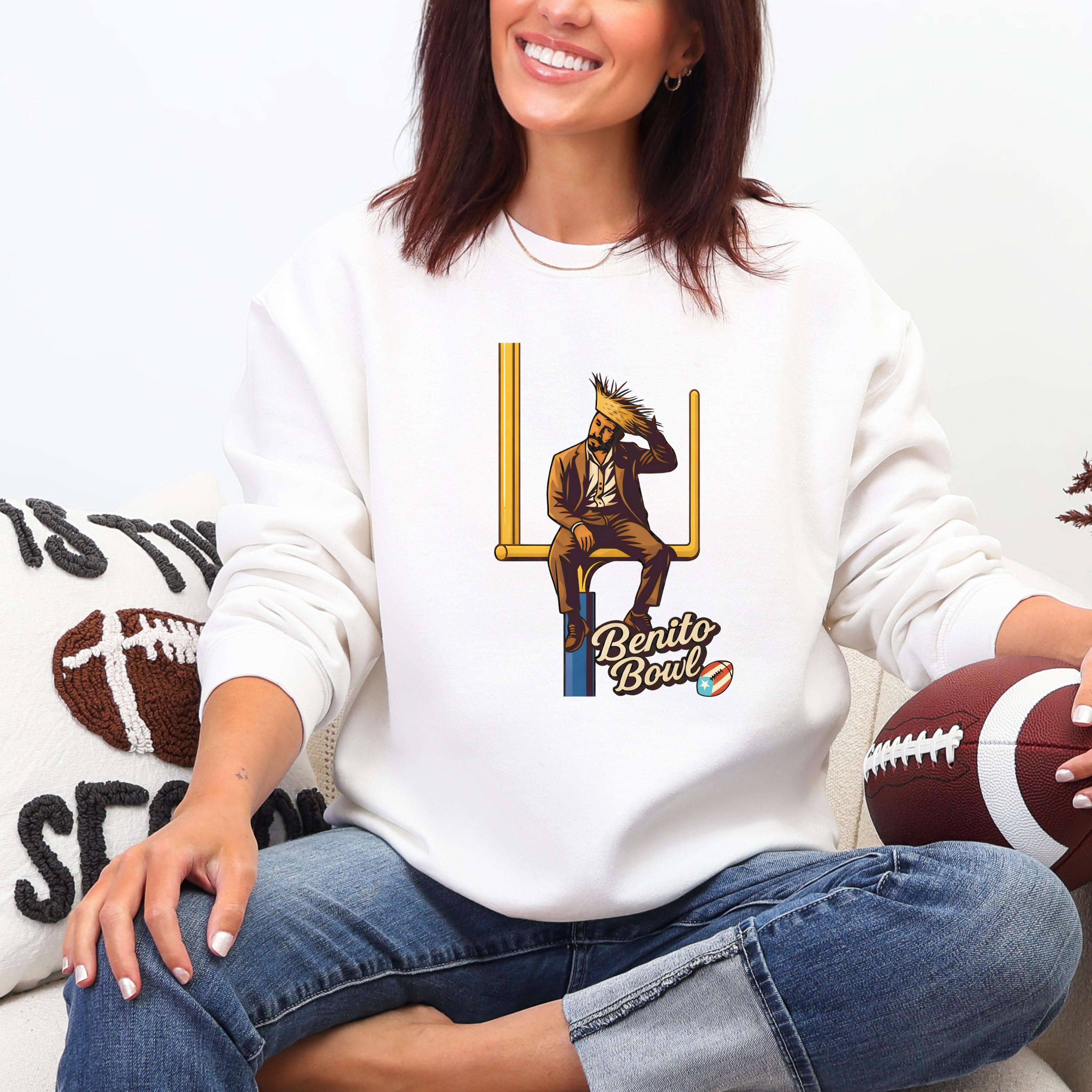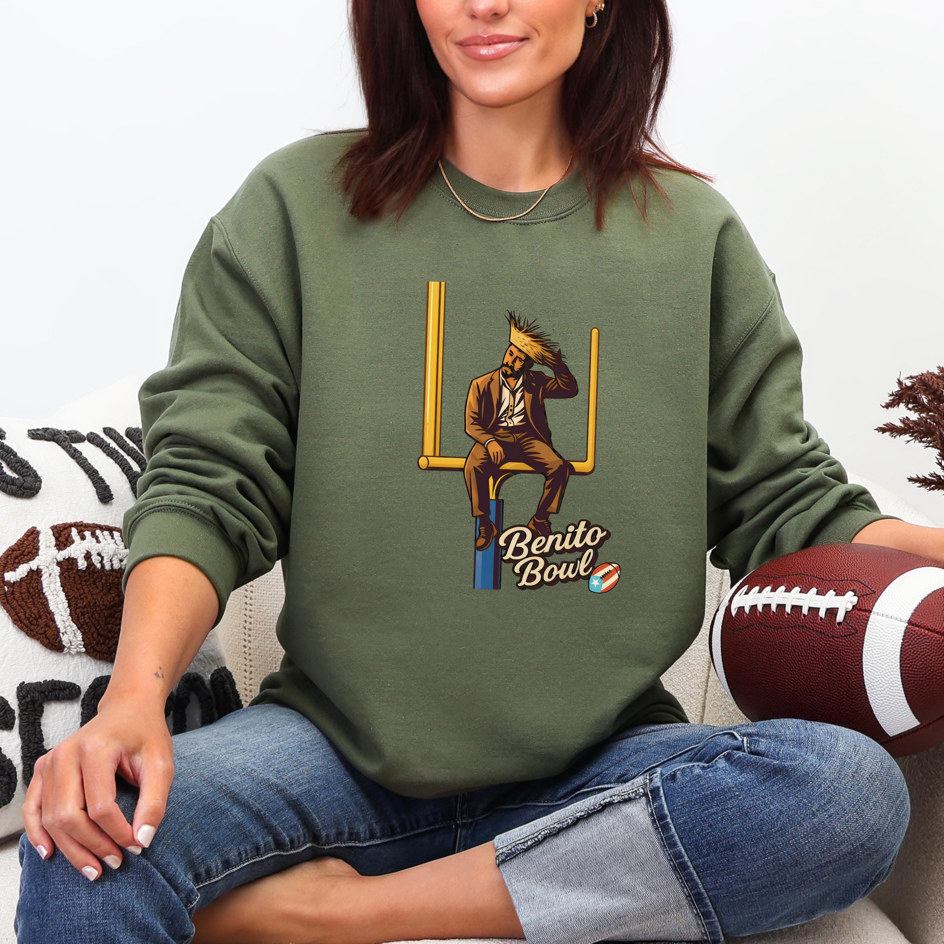 Get ready for the ultimate game day experience with this Benito Bowl graphic sweatshirt, blending Latin music culture with funny football excitement. This cozy pullover features a unique illustration of your favorite Puerto Rican artist sitting on a goal post, making it the perfect gift for music lovers and sports fans.